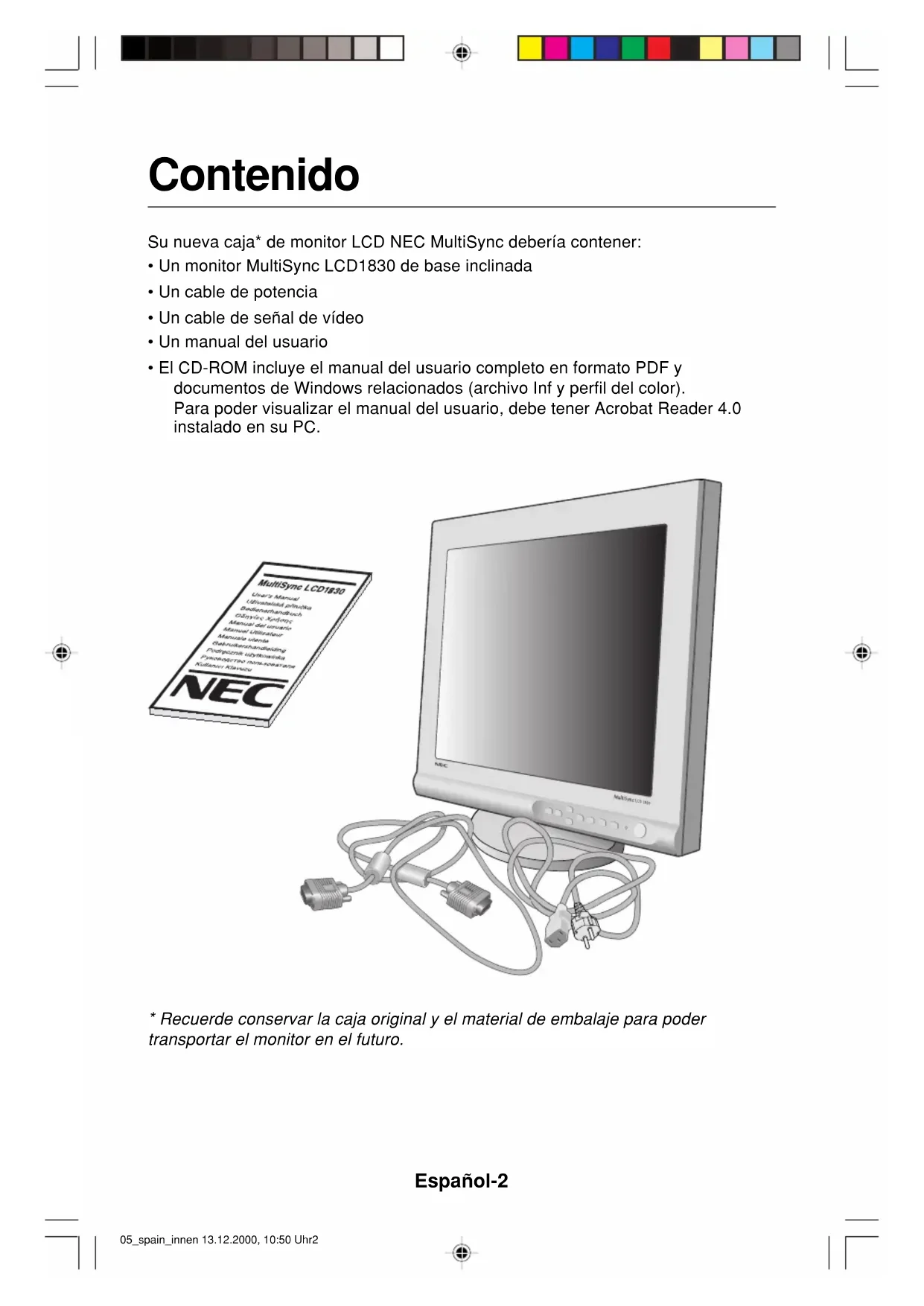 El consumo de energía del monitor es inferior a 3 W cuando está activado el modo de ahorro de energía. MultiSync LCD1830 whiteModel (LA-18S02)MultiSync LCD1830 BlackModel (LA-18S02-BK)05_spain_innen 13.12.2000, 10:50 Uhr1Español-2 Contenido Su nueva caja* de monitor LCD NEC MultiSync debería contener: