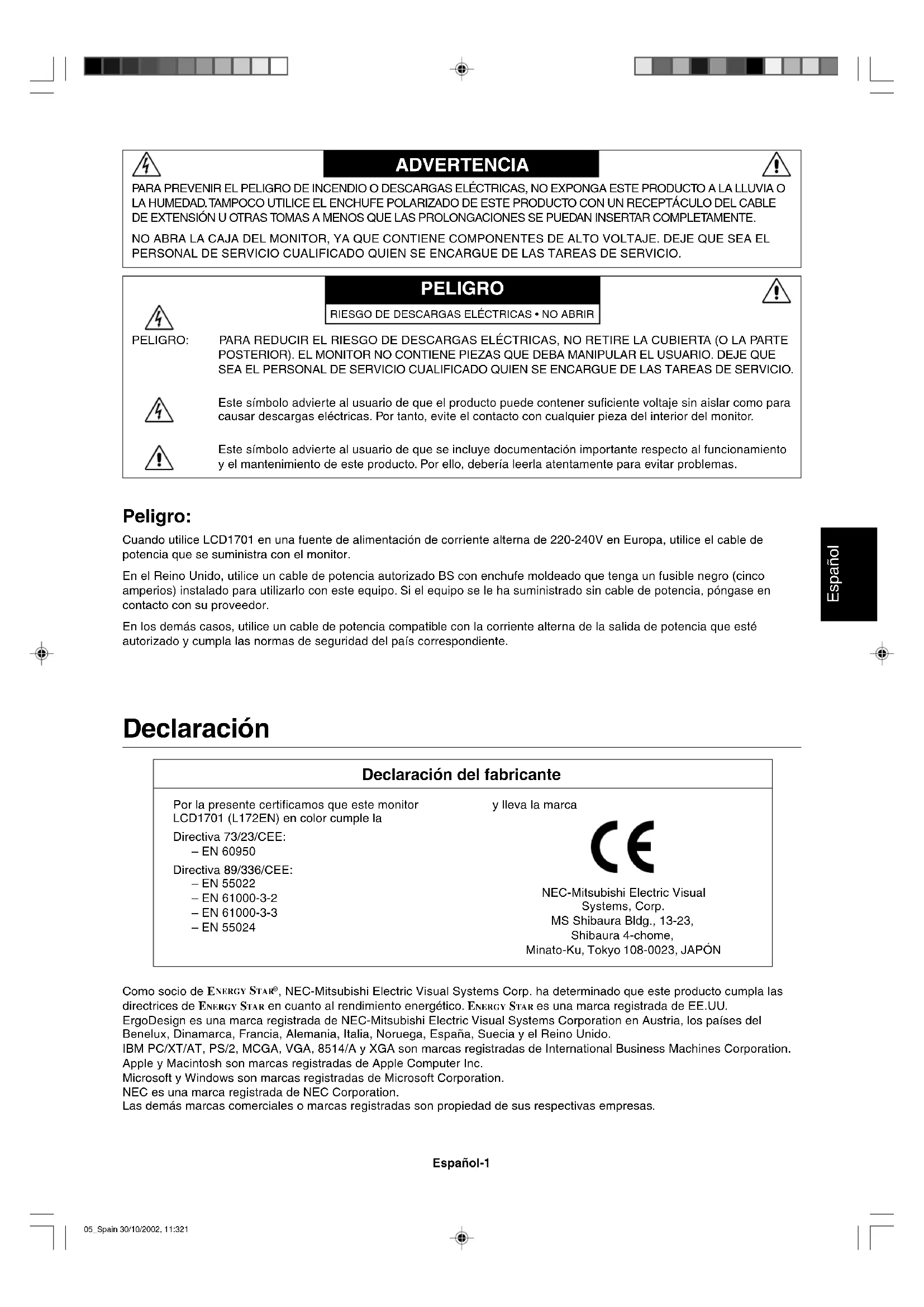 , NEC-Mitsubishi Electric Visual Systems Corp. ha determinado que este producto cumpla las directrices de ENERGY STA R en cuanto al rendimiento energético. ENERGY STAR es una marca registrada de EE.UU. ErgoDesign es una marca registrada de NEC-Mitsubishi Electric Visual Systems Corporation en Austria, los países del Benelux, Dinamarca, Francia, Alemania, Italia, Noruega, España, Suecia y el Reino Unido. IBM PC/XT/AT, PS/2, MCGA, VGA, 8514/A y XGA son marcas registradas de International Business Machines Corporation. Apple y Macintosh son marcas registradas de Apple Computer Inc. Microsoft y Windows son marcas registradas de Microsoft Corporation. NEC es una marca registrada de NEC Corporation. Las demás marcas comerciales o marcas registradas son propiedad de sus respectivas empresas. Peligro: Cuando utilice LCD1701 en una fuente de alimentación de corriente alterna de 220-240V en Europa, utilice el cable de potencia que se suministra con el monitor. En el Reino Unido, utilice un cable de potencia autorizado BS con enchufe moldeado que tenga un fusible negro (cinco amperios) instalado para utilizarlo con este equipo. Si el equipo se le ha suministrado sin cable de potencia, póngase en contacto con su proveedor. En los demás casos, utilice un cable de potencia compatible con la corriente alterna de la salida de potencia que esté autorizado y cumpla las normas de seguridad del país correspondiente. PARA PREVENIR EL PELIGRO DE INCENDIO O DESCARGAS ELÉCTRICAS, NO EXPONGA ESTE PRODUCTO A LA LLUVIA O LA HUMEDAD. TAMPOCO UTILICE EL ENCHUFE POLARIZADO DE ESTE PRODUCTO CON UN RECEPTÁCULO DEL CABLE DE EXTENSIÓN U OTRAS TOMAS A MENOS QUE LAS PROLONGACIONES SE PUEDAN INSERTAR COMPLETAMENTE. NO ABRA LA CAJA DEL MONITOR, YA QUE CONTIENE COMPONENTES DE ALTO VOLTAJE. DEJE QUE SEA EL PERSONAL DE SERVICIO CUALIFICADO QUIEN SE ENCARGUE DE LAS TAREAS DE SERVICIO. ADVERTENCIA PELIGRO PELIGRO: PARA REDUCIR EL RIESGO DE DESCARGAS ELÉCTRICAS, NO RETIRE LA CUBIERTA (O LA PARTE POSTERIOR). EL MONITOR NO CONTIENE PIEZAS QUE DEBA MANIPULAR EL USUARIO. DEJE QUE SEA EL PERSONAL DE SERVICIO CUALIFICADO QUIEN SE ENCARGUE DE LAS TAREAS DE SERVICIO. Este símbolo advierte al usuario de que el producto puede contener suficiente voltaje sin aislar como para causar descargas eléctricas. Por tanto, evite el contacto con cualquier pieza del interior del monitor. Este símbolo advierte al usuario de que se incluye documentación importante respecto al funcionamiento y el mantenimiento de este producto. Por ello, debería leerla atentamente para evitar problemas. RIESGO DE DESCARGAS ELÉCTRICAS • NO ABRIR Declaración Declaración del fabricante Por la presente certificamos que este monitor LCD1701 (L172EN) en color cumple la Directiva 73/23/CEE: – EN 60950 Directiva 89/336/CEE: – EN 55022 – EN 61000-3-2 – EN 61000-3-3 – EN 55024 y lleva la marca NEC-Mitsubishi Electric Visual Systems, Corp. MS Shibaura Bldg., 13-23, Shibaura 4-chome, Minato-Ku, Tokyo 108-0023, JAPÓN 05_Spain 30/10/2002, 11:321Español-2 Contenido Su nueva caja* de monitor LCD NEC debería contener: