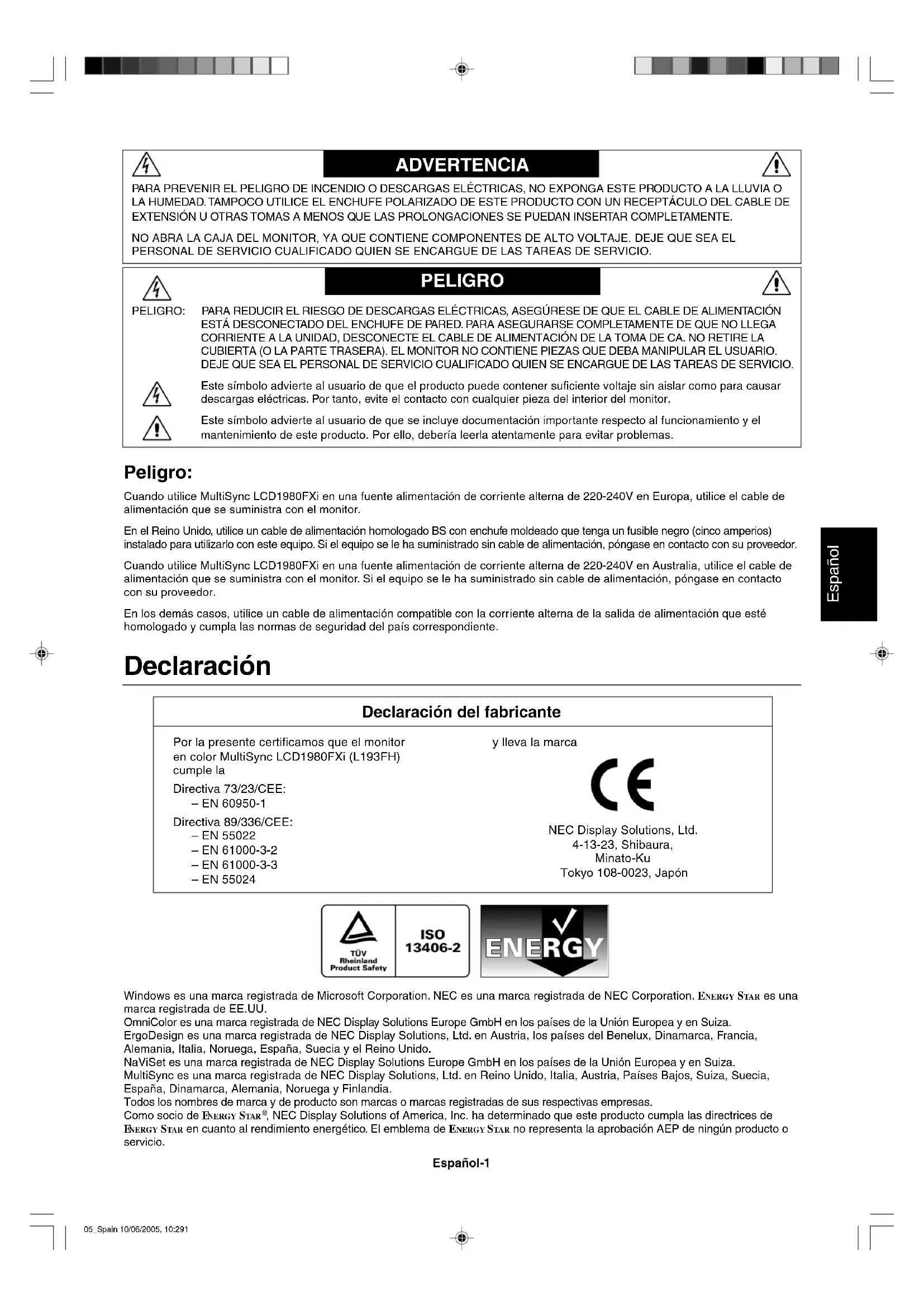 - Μη χρησιµοποιείτε το µπλε ως πρωτεύον χρώµα σε σκούρο φντο, επειδή θα είναι δύσκολο να διαβάσετε την οθνη και µπορεί να προκληθεί κπωση στα µάτια λγω ανεπαρκούς αντίθεσης. 04_Greek 10/06/2005, 10:2911Ελληνικά-12 04_Greek 10/06/2005, 10:2912Español Español-1 ADVERTENCIA PELIGRO PELIGRO: PARA REDUCIR EL RIESGO DE DESCARGAS ELÉCTRICAS, ASEGÚRESE DE QUE EL CABLE DE ALIMENTACIÓN ESTÁ DESCONECTADO DEL ENCHUFE DE PARED. PARA ASEGURARSE COMPLETAMENTE DE QUE NO LLEGA CORRIENTE A LA UNIDAD, DESCONECTE EL CABLE DE ALIMENTACIÓN DE LA TOMA DE CA. NO RETIRE LA CUBIERTA (O LA PARTE TRASERA). EL MONITOR NO CONTIENE PIEZAS QUE DEBA MANIPULAR EL USUARIO. DEJE QUE SEA EL PERSONAL DE SERVICIO CUALIFICADO QUIEN SE ENCARGUE DE LAS TAREAS DE SERVICIO. Este símbolo advierte al usuario de que el producto puede contener suficiente voltaje sin aislar como para causar descargas eléctricas. Por tanto, evite el contacto con cualquier pieza del interior del monitor. Este símbolo advierte al usuario de que se incluye documentación importante respecto al funcionamiento y el mantenimiento de este producto. Por ello, debería leerla atentamente para evitar problemas. Peligro: Cuando utilice MultiSync LCD1980FXi en una fuente alimentación de corriente alterna de 220-240V en Europa, utilice el cable de alimentación que se suministra con el monitor. En el Reino Unido, utilice un cable de alimentación homologado BS con enchufe moldeado que tenga un fusible negro (cinco amperios) instalado para utilizarlo con este equipo. Si el equipo se le ha suministrado sin cable de alimentación, póngase en contacto con su proveedor. Cuando utilice MultiSync LCD1980FXi en una fuente alimentación de corriente alterna de 220-240V en Australia, utilice el cable de alimentación que se suministra con el monitor. Si el equipo se le ha suministrado sin cable de alimentación, póngase en contacto con su proveedor. En los demás casos, utilice un cable de alimentación compatible con la corriente alterna de la salida de alimentación que esté homologado y cumpla las normas de seguridad del país correspondiente. PARA PREVENIR EL PELIGRO DE INCENDIO O DESCARGAS ELÉCTRICAS, NO EXPONGA ESTE PRODUCTO A LA LLUVIA O LA HUMEDAD. TAMPOCO UTILICE EL ENCHUFE POLARIZADO DE ESTE PRODUCTO CON UN RECEPTÁCULO DEL CABLE DE EXTENSIÓN U OTRAS TOMAS A MENOS QUE LAS PROLONGACIONES SE PUEDAN INSERTAR COMPLETAMENTE. NO ABRA LA CAJA DEL MONITOR, YA QUE CONTIENE COMPONENTES DE ALTO VOLTAJE. DEJE QUE SEA EL PERSONAL DE SERVICIO CUALIFICADO QUIEN SE ENCARGUE DE LAS TAREAS DE SERVICIO. Declaración Declaración del fabricante Por la presente certificamos que el monitor en color MultiSync LCD1980FXi (L193FH) cumple la Directiva 73/23/CEE: – EN 60950-1 Directiva 89/336/CEE: – EN 55022 – EN 61000-3-2 – EN 61000-3-3 – EN 55024 y lleva la marca NEC Display Solutions, Ltd. 4-13-23, Shibaura, Minato-Ku Tokyo 108-0023, Japón Windows es una marca registrada de Microsoft Corporation. NEC es una marca registrada de NEC Corporation. ENERGY STA R es una marca registrada de EE.UU. OmniColor es una marca registrada de NEC Display Solutions Europe GmbH en los países de la Unión Europea y en Suiza. ErgoDesign es una marca registrada de NEC Display Solutions, Ltd. en Austria, los países del Benelux, Dinamarca, Francia, Alemania, Italia, Noruega, España, Suecia y el Reino Unido. NaViSet es una marca registrada de NEC Display Solutions Europe GmbH en los países de la Unión Europea y en Suiza. MultiSync es una marca registrada de NEC Display Solutions, Ltd. en Reino Unido, Italia, Austria, Países Bajos, Suiza, Suecia, España, Dinamarca, Alemania, Noruega y Finlandia. Todos los nombres de marca y de producto son marcas o marcas registradas de sus respectivas empresas. Como socio de E NERGY STAR