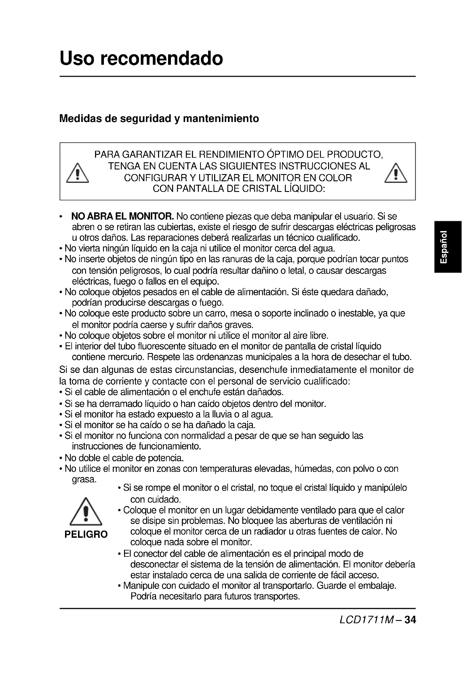 - Manipule con cuidado el monitor al transportarlo. Guarde el embalaje. Podría necesitarlo para futuros transportes. PELIGRO35 – Manual del usuario Español Uso recomendado – continuación