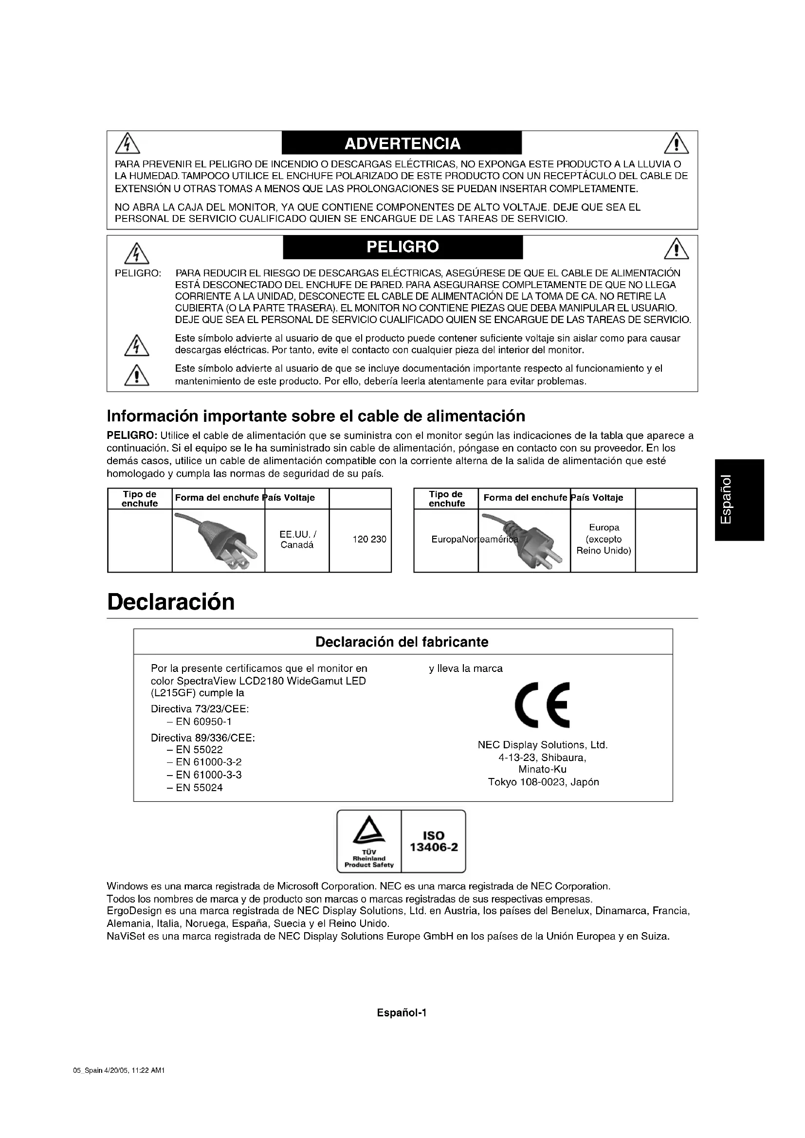 Στην επιφάνεια της κονσλας υπάρχουν πολλά πλαστικά εξαρτήµατα. ΜΗΝ καθαρίζετε µε βενζίνη, αλκαλικά απορρυπαντικά, απορρυπαντικά µε οινπνευµα, καθαριστικά τζαµιών, κερί, καθαριστικά γυαλίσµατος, σκνη σαπουνιού ή εντοµοκτνο. Μην τοποθετείτε πάνω στην κονσλα αντικείµενα απ πλαστικ ή βινύλιο για πολλή ώρα. Τέτοιου είδους υγρά ή υφάσµατα ενδέχεται να προκαλέσουν φθορά, ξεφλούδισµα ή σπάσιµο της βαφής. 04_Greek 4/20/05, 11:22 AM9Ελληνικά-10 04_Greek 4/20/05, 11:22 AM10Español Español-1 ADVERTENCIA PELIGRO PELIGRO: PARA REDUCIR EL RIESGO DE DESCARGAS ELÉCTRICAS, ASEGÚRESE DE QUE EL CABLE DE ALIMENTACIÓN ESTÁ DESCONECTADO DEL ENCHUFE DE PARED. PARA ASEGURARSE COMPLETAMENTE DE QUE NO LLEGA CORRIENTE A LA UNIDAD, DESCONECTE EL CABLE DE ALIMENTACIÓN DE LA TOMA DE CA. NO RETIRE LA CUBIERTA (O LA PARTE TRASERA). EL MONITOR NO CONTIENE PIEZAS QUE DEBA MANIPULAR EL USUARIO. DEJE QUE SEA EL PERSONAL DE SERVICIO CUALIFICADO QUIEN SE ENCARGUE DE LAS TAREAS DE SERVICIO. Este símbolo advierte al usuario de que el producto puede contener suficiente voltaje sin aislar como para causar descargas eléctricas. Por tanto, evite el contacto con cualquier pieza del interior del monitor. Este símbolo advierte al usuario de que se incluye documentación importante respecto al funcionamiento y el mantenimiento de este producto. Por ello, debería leerla atentamente para evitar problemas. PARA PREVENIR EL PELIGRO DE INCENDIO O DESCARGAS ELÉCTRICAS, NO EXPONGA ESTE PRODUCTO A LA LLUVIA O LA HUMEDAD. TAMPOCO UTILICE EL ENCHUFE POLARIZADO DE ESTE PRODUCTO CON UN RECEPTÁCULO DEL CABLE DE EXTENSIÓN U OTRAS TOMAS A MENOS QUE LAS PROLONGACIONES SE PUEDAN INSERTAR COMPLETAMENTE. NO ABRA LA CAJA DEL MONITOR, YA QUE CONTIENE COMPONENTES DE ALTO VOLTAJE. DEJE QUE SEA EL PERSONAL DE SERVICIO CUALIFICADO QUIEN SE ENCARGUE DE LAS TAREAS DE SERVICIO. Declaración Declaración del fabricante Por la presente certificamos que el monitor en color SpectraView LCD2180 WideGamut LED (L215GF) cumple la Directiva 73/23/CEE: – EN 60950-1 Directiva 89/336/CEE: – EN 55022 – EN 61000-3-2 – EN 61000-3-3 – EN 55024 y lleva la marca NEC Display Solutions, Ltd. 4-13-23, Shibaura, Minato-Ku Tokyo 108-0023, Japón Windows es una marca registrada de Microsoft Corporation. NEC es una marca registrada de NEC Corporation. Todos los nombres de marca y de producto son marcas o marcas registradas de sus respectivas empresas. ErgoDesign es una marca registrada de NEC Display Solutions, Ltd. en Austria, los países del Benelux, Dinamarca, Francia, Alemania, Italia, Noruega, España, Suecia y el Reino Unido. NaViSet es una marca registrada de NEC Display Solutions Europe GmbH en los países de la Unión Europea y en Suiza. Información importante sobre el cable de alimentación PELIGRO: Utilice el cable de alimentación que se suministra con el monitor según las indicaciones de la tabla que aparece a continuación. Si el equipo se le ha suministrado sin cable de alimentación, póngase en contacto con su proveedor. En los demás casos, utilice un cable de alimentación compatible con la corriente alterna de la salida de alimentación que esté homologado y cumpla las normas de seguridad de su país. Tipo deenchufeEuropaNorteaméricaForma del enchufe País Voltaje120 230EE.UU. /CanadáEuropa(exceptoReino Unido)Forma del enchufe País VoltajeTipo deenchufe05_Spain 4/20/05, 11:22 AM1Español-2