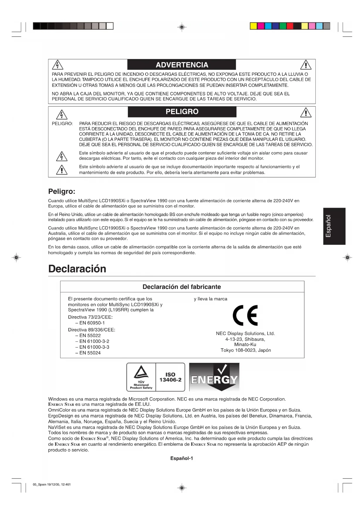 - Για να καθαρίσετε την κονσλα, βρέξτε το πανί µε ένα ήπιο καθαριστικ και νερ, σκουπίστε µε αυτ την κονσλα και µετά µε ένα στεγν πανί. ΣΗΜΕΙΩΣΗ: Στην επιφάνεια τησ κονσλασ υπάρχουν πολλά πλαστικά µέρη. ΜΗΝ καθαρίζετε µε βενζλη, διαλυτικ, αλκαλικά απορρυπαντικά, απορρυπαντικά µε αλκολ, καθαριστικ τζαµιών, κερί, καθαριστικ λείανσησ, σκνη σαπουνιού ή εντοµοκτνο. Μην ακουµπάτε πλαστικ ή βινύλιο για πολλή ώρα πάνω στην κονσλα. Τέτοιου είδουσ υγρά ή υφάσµατα ενδέχεται να προκαλέσουν φθορά, ξεφλούδισµα ή σπάσιµο τησ βαφήσ. 04_Greek 19/12/05, 12:4514Español Español-1 ADVERTENCIA PELIGRO PELIGRO: PARA REDUCIR EL RIESGO DE DESCARGAS ELÉCTRICAS, ASEGÚRESE DE QUE EL CABLE DE ALIMENTACIÓN ESTÁ DESCONECTADO DEL ENCHUFE DE PARED. PARA ASEGURARSE COMPLETAMENTE DE QUE NO LLEGA CORRIENTE A LA UNIDAD, DESCONECTE EL CABLE DE ALIMENTACIÓN DE LA TOMA DE CA. NO RETIRE LA CUBIERTA (O LA PARTE TRASERA). EL MONITOR NO CONTIENE PIEZAS QUE DEBA MANIPULAR EL USUARIO. DEJE QUE SEA EL PERSONAL DE SERVICIO CUALIFICADO QUIEN SE ENCARGUE DE LAS TAREAS DE SERVICIO. Este símbolo advierte al usuario de que el producto puede contener suficiente voltaje sin aislar como para causar descargas eléctricas. Por tanto, evite el contacto con cualquier pieza del interior del monitor. Este símbolo advierte al usuario de que se incluye documentación importante respecto al funcionamiento y el mantenimiento de este producto. Por ello, debería leerla atentamente para evitar problemas. Peligro: Cuando utilice MultiSync LCD1990SXi o SpectraView 1990 con una fuente alimentación de corriente alterna de 220-240V en Europa, utilice el cable de alimentación que se suministra con el monitor. En el Reino Unido, utilice un cable de alimentación homologado BS con enchufe moldeado que tenga un fusible negro (cinco amperios) instalado para utilizarlo con este equipo. Si el equipo se le ha suministrado sin cable de alimentación, póngase en contacto con su proveedor. Cuando utilice MultiSync LCD1990SXi o SpectraView 1990 con una fuente alimentación de corriente alterna de 220-240V en Australia, utilice el cable de alimentación que se suministra con el monitor. Si el equipo no incluye ningún cable de alimentación, póngase en contacto con su proveedor. En los demás casos, utilice un cable de alimentación compatible con la corriente alterna de la salida de alimentación que esté homologado y cumpla las normas de seguridad del país correspondiente. PARA PREVENIR EL PELIGRO DE INCENDIO O DESCARGAS ELÉCTRICAS, NO EXPONGA ESTE PRODUCTO A LA LLUVIA O LA HUMEDAD. TAMPOCO UTILICE EL ENCHUFE POLARIZADO DE ESTE PRODUCTO CON UN RECEPTÁCULO DEL CABLE DE EXTENSIÓN U OTRAS TOMAS A MENOS QUE LAS PROLONGACIONES SE PUEDAN INSERTAR COMPLETAMENTE. NO ABRA LA CAJA DEL MONITOR, YA QUE CONTIENE COMPONENTES DE ALTO VOLTAJE. DEJE QUE SEA EL PERSONAL DE SERVICIO CUALIFICADO QUIEN SE ENCARGUE DE LAS TAREAS DE SERVICIO. Declaración Declaración del fabricante El presente documento certifica que los monitores en color MultiSync LCD1990SXi y SpectraView 1990 (L195RR) cumplen la Directiva 73/23/CEE: – EN 60950-1 Directiva 89/336/CEE: – EN 55022 – EN 61000-3-2 – EN 61000-3-3 – EN 55024 y lleva la marca NEC Display Solutions, Ltd. 4-13-23, Shibaura, Minato-Ku Tokyo 108-0023, Japón Windows es una marca registrada de Microsoft Corporation. NEC es una marca registrada de NEC Corporation. ENERGY STA R es una marca registrada de EE.UU. OmniColor es una marca registrada de NEC Display Solutions Europe GmbH en los países de la Unión Europea y en Suiza. ErgoDesign es una marca registrada de NEC Display Solutions, Ltd. en Austria, los países del Benelux, Dinamarca, Francia, Alemania, Italia, Noruega, España, Suecia y el Reino Unido. NaViSet es una marca registrada de NEC Display Solutions Europe GmbH en los países de la Unión Europea y en Suiza. Todos los nombres de marca y de producto son marcas o marcas registradas de sus respectivas empresas. Como socio de ENERGY STA R