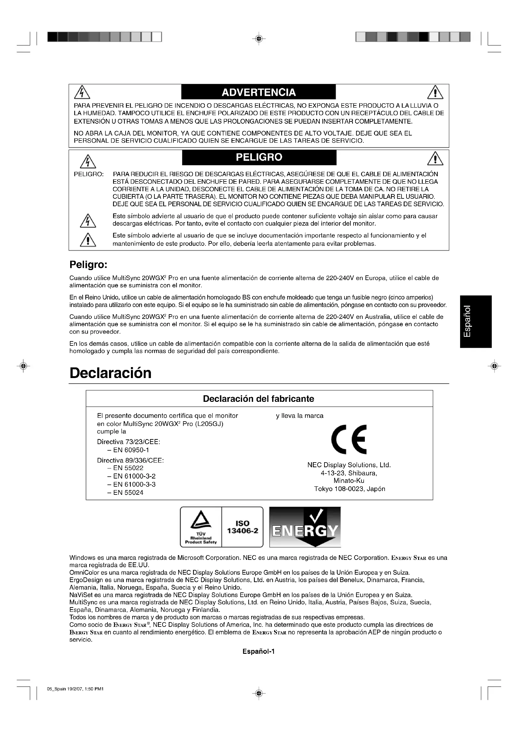 Pro (L205GJ) cumple la Directiva 73/23/CEE: – EN 60950-1 Directiva 89/336/CEE: – EN 55022 – EN 61000-3-2 – EN 61000-3-3 – EN 55024 y lleva la marca NEC Display Solutions, Ltd. 4-13-23, Shibaura, Minato-Ku Tokyo 108-0023, Japón Windows es una marca registrada de Microsoft Corporation. NEC es una marca registrada de NEC Corporation. ENERGY STAR es una marca registrada de EE.UU. OmniColor es una marca registrada de NEC Display Solutions Europe GmbH en los países de la Unión Europea y en Suiza. ErgoDesign es una marca registrada de NEC Display Solutions, Ltd. en Austria, los países del Benelux, Dinamarca, Francia, Alemania, Italia, Noruega, España, Suecia y el Reino Unido. NaViSet es una marca registrada de NEC Display Solutions Europe GmbH en los países de la Unión Europea y en Suiza. MultiSync es una marca registrada de NEC Display Solutions, Ltd. en Reino Unido, Italia, Austria, Países Bajos, Suiza, Suecia, España, Dinamarca, Alemania, Noruega y Finlandia. Todos los nombres de marca y de producto son marcas o marcas registradas de sus respectivas empresas. Como socio de E NERGY STAR