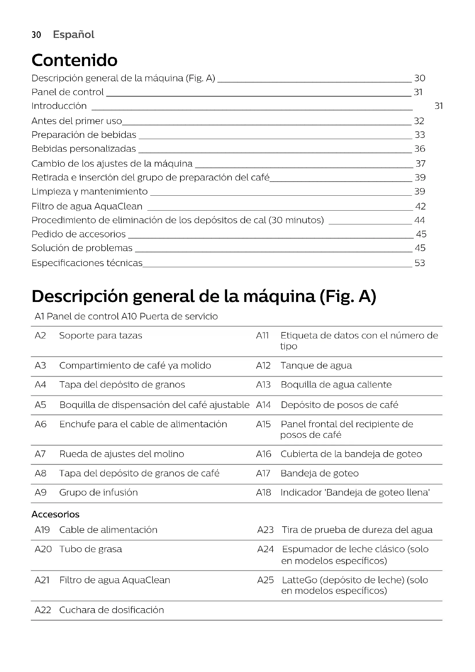 Español EspañolProblema Causa Solución Si se añade leche, se reduce la temperatura de la bebida. Independientemente de si añade leche caliente o fría, añadir leche siempre reduce la temperatura del café. Precaliente las tazas enjuagándolas con agua caliente. El café no sale o sale lentamente. El filtro de agua AquaClean no se ha preparado correctamente para su instalación. Quite el filtro de agua AquaClean y dispense un poco de agua caliente. Si esto funciona, el filtro de agua AquaClean no estaba instalado correctamente. Vuelva a instalar y activar el filtro AquaClean y siga todos los pasos indicados en el capítulo "Filtro de agua AquaClean". Tras un largo periodo sin uso, es necesario preparar el filtro de agua AquaClean para volver a usarlo y dispensar 2 o 3 tazas de agua caliente. El filtro de agua AquaClean está obstruido. Cambie el filtro de agua AquaClean cada 3 meses. Un filtro de más de 3meses puede obstruirse. El molino está en una configuración demasiado fina. Ajuste el molino a una configuración más gruesa (alta). Tenga en cuenta que esto afectará al sabor del café. El grupo de café está sucio. Quite el grupo de café y enjuáguelo bajo la llave de agua (ver 'Cómo limpiar el grupo de café bajo la llave'). La salida de café está sucia. Limpie la boquilla dispensadora de café y sus orificios con un limpiapipas o una aguja. El compartimento de café molido previamente está obstruido Apague el aparato y retire el grupo de preparación del café. Abra la tapa del compartimento de café molido previamente e introduzca en él el mango de la cuchara. Mueva el mango hacia arriba y hacia abajo hasta que caiga el café atorado (Fig. 34). El circuito de la máquina está bloqueado por residuos de cal. Descalcifique el aparato con el descalcificador Philips. Descalcifique el aparato siempre que esta se lo indique.