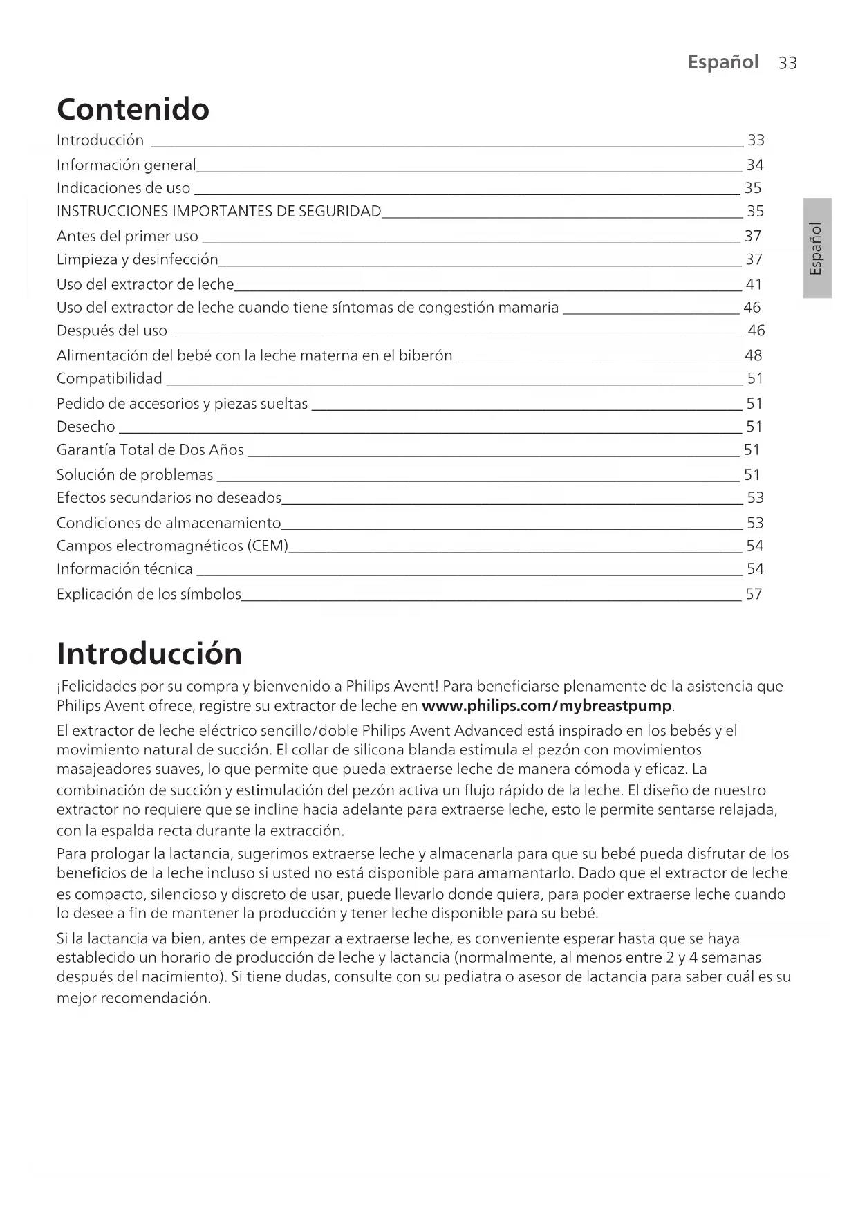 - Para estos accesorios se incluye un manual del usuario separado.35 Español Español Indicaciones de uso El extractor de leche eléctrico simple/doble Philips Avent Advanced está diseñado para extraer y recolectar leche materna de una mujer en periodo de lactancia y para aliviar la congestión mamaria. El dispositivoha sido diseñado para el uso personal.