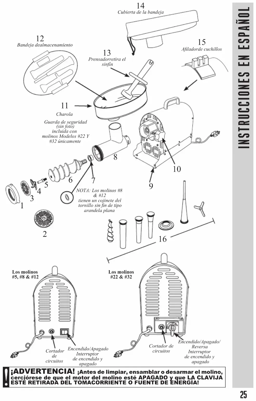 Cortador circuitosEncendido/ApagadoInterruptorde encendido y apagadoCortador decircuitosEncendido/Apagado/ReversaInterruptorde encendido y apagadoLos molinos#5, #8 & #12Los molinos#22 & #32 CharolaGuarda de seguridad (sin foto)incluida conmolinos Modelos #22 Y #32 únicamente