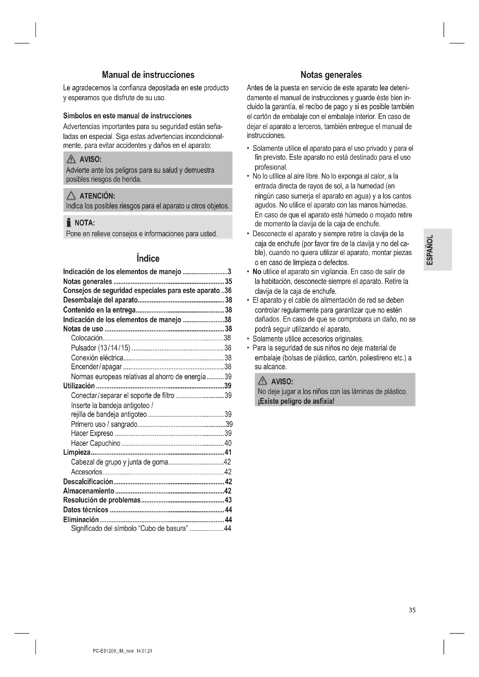 Problema Posible causa Solución Sin crema en el expreso. El polvo de expreso no es adecuado. Cambie de marca, si es necesario. La leche no espuma. La leche no es adecuada. Utilice leche con un contenido de grasa de por lo menos el 3,5 %. La leche no está sucientemente fría. Utilice leche refrigerada. La boquilla de vapor está sucia. Limpie la boquilla de vapor como se indica. El proceso de preparación no puede iniciarse. El testigo de control de fun- cionamiento pulsará. Esto no es un fallo de funcionamiento del aparato. Para cumplir con la Directiva de Ecodiseño (2009 / 125 / CE), el aparato pasa automá- ticamente a modo espera, un máximo de 20 minutos después de nalizar el proceso de preparación. Para volver a usar el aparato, apáguelo con el interrup- tor de presión . Espere a que se apague el testigo de control de funcionamiento. Vuelva a encender el aparato. Datos técnicos Modelo: ...............................................................PC-ES 1209 Suministro de tensión: .......................220 - 240 V~, 50 / 60 Hz Consumo de energía: ...................................................850 W Capacidad: .............................................................. máx. 1,8 ℓ Clase de protección: .............................................................. Presión: .........................................................................20 bar Peso neto: ............................................................. aprox. 4 kg El derecho de realizar modicaciones técnicas y de diseño en el curso del desarrollo continuo del producto esta reservado. Este dispositivo cumple con todas las directrices CE actua- les, como la directriz de compatibilidad electromagnética y de bajo voltaje, y está fabricada según las últimas normas de seguridad. Eliminación Signicado del símbolo “Cubo de basura” Proteja nuestro medio ambiente, aparatos eléc- tricos no forman parte de la basura doméstica. Haga uso de los centros de recogida previstos para la eliminación de aparatos eléctricos y entregue allí sus aparatos eléctricos que no vaya a utilizar más. Ayudará en evitar las potenciales consecuencias, a causa de una errónea eliminación de desechos, para el medio ambiente y la salud humana. Con ello, contribuirá a la recuperación, al reciclado y a otras formas de reutilización de los aparatos viejos eléctricos y electrónicos. La información cómo se debe eliminar los aparatos, se obtiene en su ayuntamiento o su administración municipal.PC-ES1209_IM_new 14.01.21