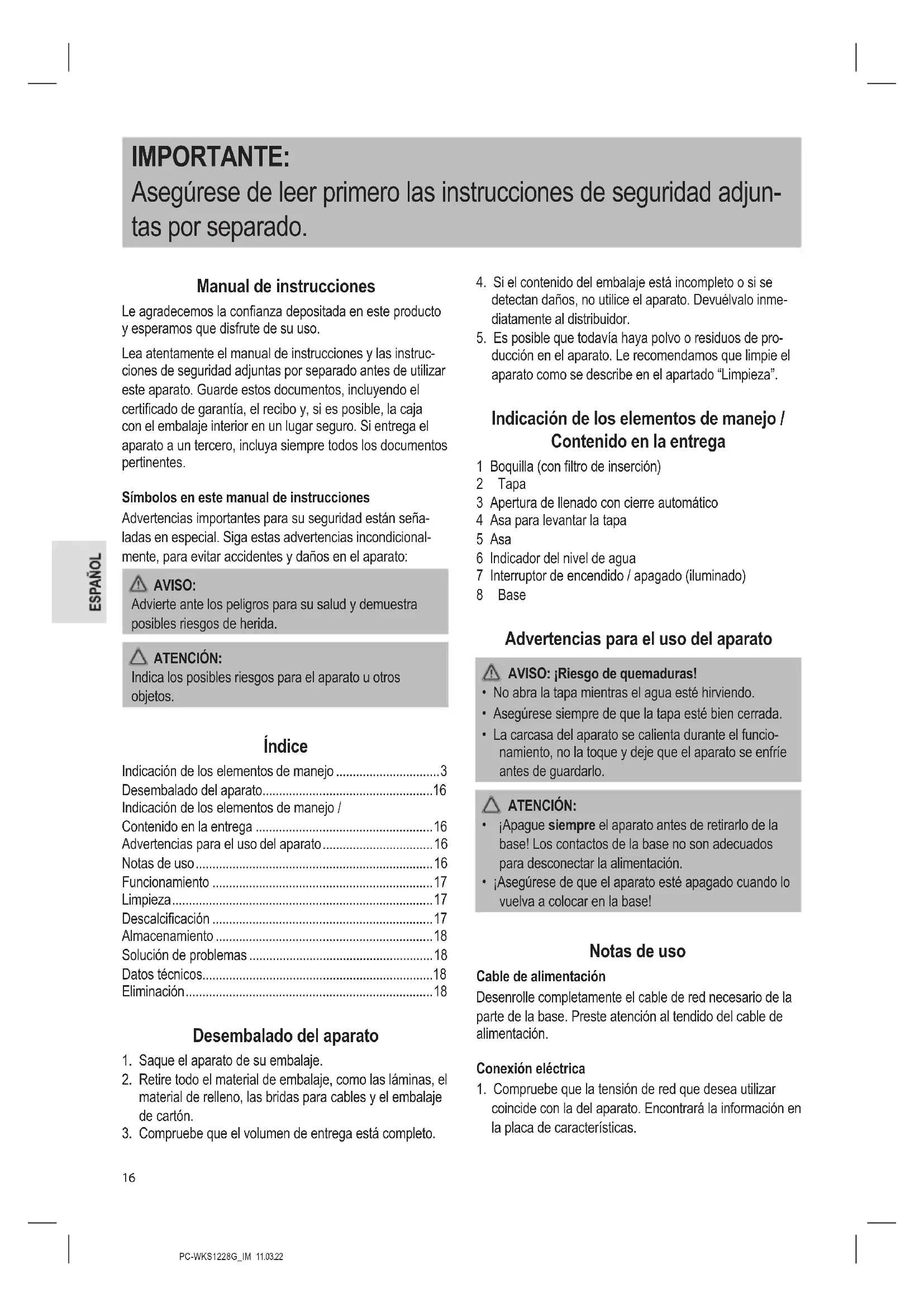 - Guarde siempre el aparato fuera del alcance de los niños en un lugar bien ventilado y seco. Dispositivo para enrollar el cable de red Puede enrollar el cable de red en la parte inferior. Solución de problemas Problema Posible causa Remedio El aparato no se enciende. El aparato no tiene alimentación eléctrica. Compruebe la toma de corriente con otro aparato. Inserte correctamente el enchufe de la red. Compruebe el fusible de la casa. El aparato está defectuoso. Póngase en contacto con nuestro servicio técnico o con un especialista. Después de funcionar sin agua o con muy poca agua, el aparato no se ha enfriado lo suciente. Deje que el aparato se enfríe durante 15 minutos. El aparato se apaga antes de cocinar. El interior del hervidor está muy calcicado o el circuito de la toma de corriente está sobrecargado. Descalcique según las instrucciones. Compruebe la conexión a la red eléctrica. El aparato no se apaga. La tapa no está cerrada. Cierre la tapa hasta que encaje. Datos técnicos Modelo: ....................................................... PC-WKS 1228 G Alimentación: ......................................220 – 240 V~, 50 – 60 Hz Consumo de energía: ........................................ 900 – 1100 W Clase de protección: .............................................................. Capacidad de llenado: ..................................... máx. 0,5 litros Peso neto: ........................................................ aprox. 0,74 kg El derecho de realizar modicaciones técnicas y de diseño en el curso del desarrollo continuo del producto esta reservado. Este aparato ha sido probado de acuerdo con todas las directivas CE vigentes y construido de acuerdo con las últimas normas de seguridad. Eliminación Signicado del símbolo “Cubo de basura” Proteja nuestro medio ambiente, aparatos eléc- tricos no forman parte de la basura doméstica. Haga uso de los centros de recogida previstos para la eliminación de aparatos eléctricos y entregue allí sus aparatos eléctricos que no vaya a utilizar más. Ayudará en evitar las potenciales consecuencias, a causa de una errónea eliminación de desechos, para el medio ambiente y la salud humana. Con ello, contribuirá a la recuperación, al reciclado y a otras formas de reutilización de los aparatos viejos eléctricos y electrónicos. La información cómo se debe eliminar los aparatos, se obtiene en su ayuntamiento o su administración municipal. Su distribuidor y socio contractual también está obligado a recuperar el aparato antiguo sin coste alguno.PC-WKS1228G_IM 11.03.22