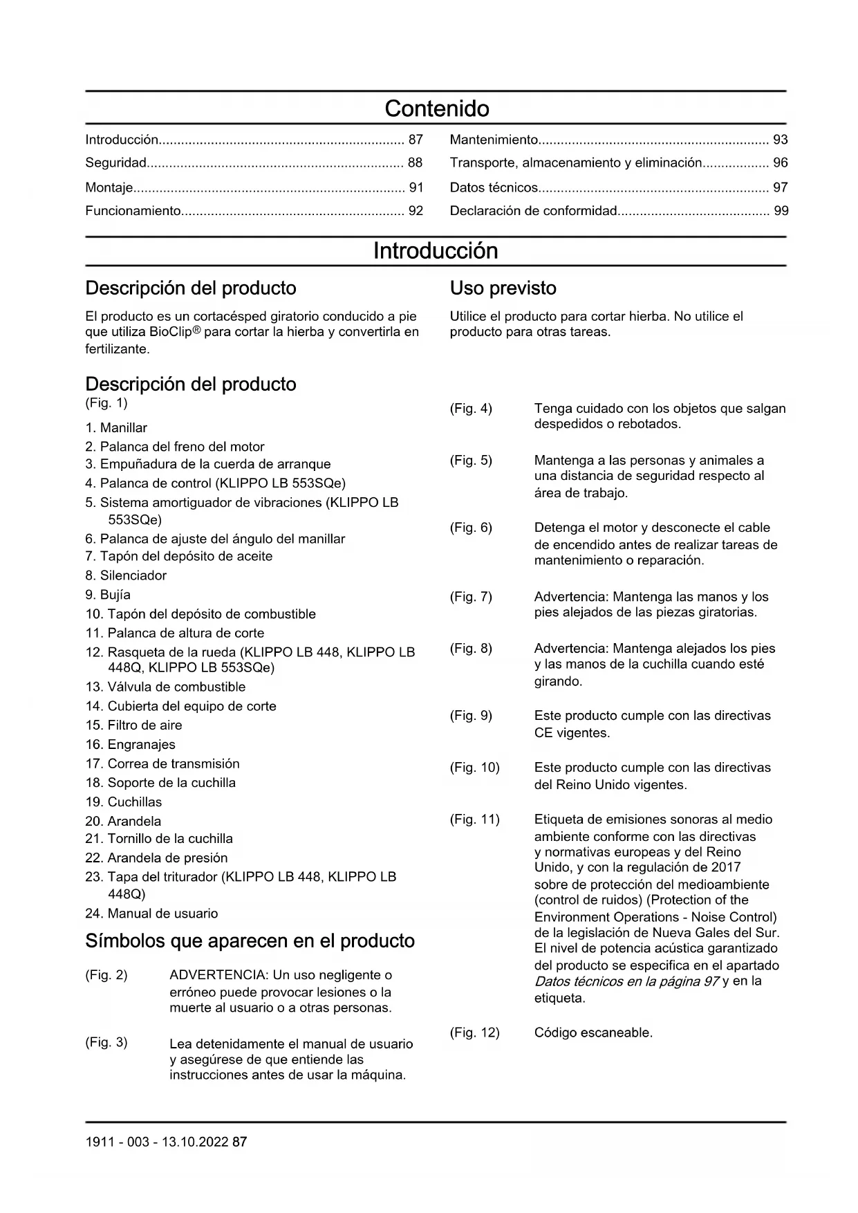 Símbolos que aparecen en el producto (Fig. 2) ADVERTENCIA: Un uso negligente o erróneo puede provocar lesiones o la muerte al usuario o a otras personas. (Fig. 3) Lea detenidamente el manual de usuario y asegúrese de que entiende las instrucciones antes de usar la máquina. (Fig. 4) Tenga cuidado con los objetos que salgan despedidos o rebotados. (Fig. 5) Mantenga a las personas y animales a una distancia de seguridad respecto al área de trabajo. (Fig. 6) Detenga el motor y desconecte el cable de encendido antes de realizar tareas de mantenimiento o reparación. (Fig. 7) Advertencia: Mantenga las manos y los pies alejados de las piezas giratorias. (Fig. 8) Advertencia: Mantenga alejados los pies y las manos de la cuchilla cuando esté girando. (Fig. 9) Este producto cumple con las directivas CE vigentes. (Fig. 10) Este producto cumple con las directivas del Reino Unido vigentes. (Fig. 11) Etiqueta de emisiones sonoras al medio ambiente conforme con las directivas y normativas europeas y del Reino Unido, y con la regulación de 2017 sobre de protección del medioambiente (control de ruidos) (Protection of the Environment Operations - Noise Control) de la legislación de Nueva Gales del Sur. El nivel de potencia acústica garantizado del producto se especifica en el apartado Datos técnicos en la página 97 y en la etiqueta. (Fig. 12) Código escaneable. 1911 - 003 - 13.10.2022 87Nota: Otros símbolos/etiquetas del producto hacen referencia a los requisitos legales específicos del mercado. Etiqueta en el producto, solo para Australia y Nueva Zelanda (Fig. 13) Mantenga alejados las manos y los pies de la cuchilla giratoria. Emisiones Euro V ADVERTENCIA: La manipulación del motor anula la homologación de la UE de este producto. Responsabilidad sobre el producto Como se estipula en las leyes de responsabilidad del producto, no nos hacemos responsables de los daños y perjuicios causados por nuestro producto si: