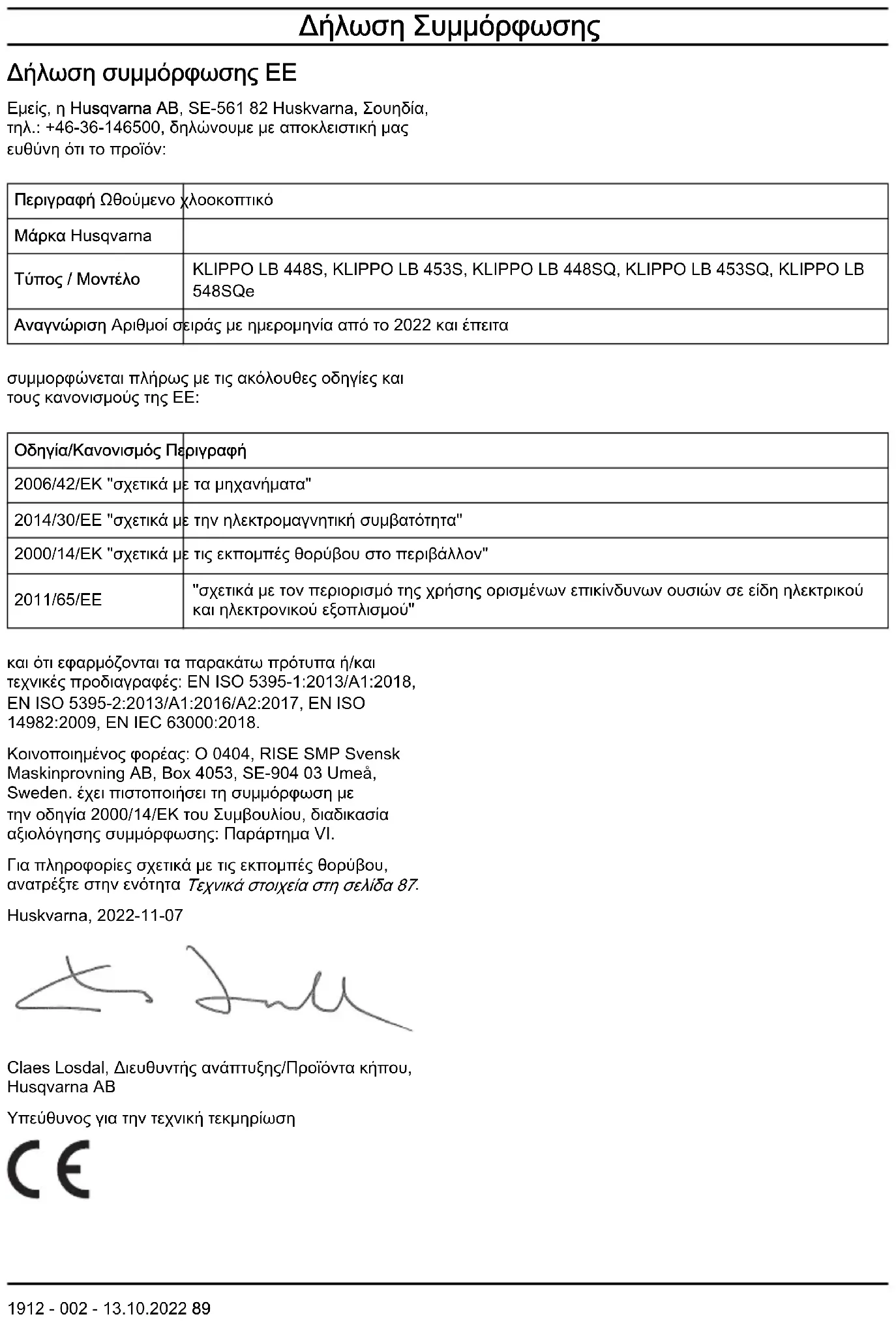 102 1912 - 002 - 13.10.2022Declaración de conformidad Declaración de conformidad UE Nosotros, Husqvarna AB, SE-561 82 Huskvarna (Suecia), tel. +46-36-146500, declaramos bajo nuestra exclusiva responsabilidad que el producto: Descripción Cortacésped Marca Husqvarna Tipo/Modelo KLIPPO LB 448S, KLIPPO LB 453S, KLIPPO LB 448SQ, KLIPPO LB 453SQ, KLIPPO LB 548SQe Identificación Números de serie a partir del año 2022 Cumple las siguientes directivas y normas de la UE: Directiva/Norma Descripción 2006/42/CE "relativa a las máquinas" 2014/30/UE "relativa a la compatibilidad electromagnética" 2000/14/CE "relativa a las emisiones sonoras en el entorno" 2011/65/UE "relativa a restricciones de utilización de determinadas sustancias peligrosas en aparatos eléctricos y electrónicos" Y que se aplican las especificaciones técnicas o los estándares siguientes: EN ISO 5395-1:2013/ A1:2018, EN ISO 5395-2:2013/A1:2016/A2:2017, EN ISO 14982:2009, EN IEC 63000:2018. Organismo notificado: 0404, RISE SMP Svensk Maskinprovning AB, Box 4053, SE-904 03 Umeå, Sweden. ha certificado la conformidad con la Directiva del Consejo 2000/14/CE, Procedimiento de evaluación de conformidad: Anexo VI. Para obtener información respecto a las emisiones sonoras, consulte Datos técnicos en la página 100