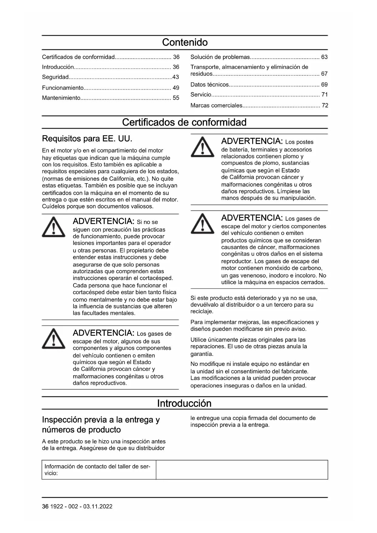 - Marcas comerciales Certificados de conformidad Requisitos para EE.UU. En el motor y/o en el compartimiento del motor hay etiquetas que indican que la máquina cumple con los requisitos. Esto también es aplicable a requisitos especiales para cualquiera de los estados, (normas de emisiones de California, etc.). No quite estas etiquetas. También es posible que se incluyan certificados con la máquina en el momento de su entrega o que estén escritos en el manual del motor. Cuídelos porque son documentos valiosos. ADVERTENCIA: Si no se siguen con precaución las prácticas de funcionamiento, puede provocar lesiones importantes para el operador u otras personas. El propietario debe entender estas instrucciones y debe asegurarse de que solo personas autorizadas que comprenden estas instrucciones operarán el cortacésped. Cada persona que hace funcionar el cortacésped debe estar bien tanto física como mentalmente y no debe estar bajo la influencia de sustancias que alteren las facultades mentales. ADVERTENCIA: Los gases de escape del motor, algunos de sus componentes y algunos componentes del vehículo contienen o emiten químicos que según el Estado de California provocan cáncer y malformaciones congénitas u otros daños reproductivos. ADVERTENCIA: Los postes de batería, terminales y accesorios relacionados contienen plomo y compuestos de plomo, sustancias químicas que según el Estado de California provocan cáncer y malformaciones congénitas u otros daños reproductivos. Límpiese las manos después de su manipulación. ADVERTENCIA: Los gases de escape del motor y ciertos componentes del vehículo contienen o emiten productos químicos que se consideran causantes de cáncer, malformaciones congénitas u otros daños en el sistema reproductor. Los gases de escape del motor contienen monóxido de carbono, un gas venenoso, inodoro e incoloro. No utilice la máquina en espacios cerrados. Si este producto está deteriorado y ya no se usa, devuélvalo al distribuidor o a un tercero para su reciclaje. Para implementar mejoras, las especificaciones y diseños pueden modificarse sin previo aviso. Utilice únicamente piezas originales para las reparaciones. El uso de otras piezas anula la garantía. No modifique ni instale equipo no estándar en la unidad sin el consentimiento del fabricante. Las modificaciones a la unidad pueden provocar operaciones inseguras o daños en la unidad. Introducción Inspección previa a la entrega y números de producto A este producto se le hizo una inspección antes de la entrega. Asegúrese de que su distribuidor le entregue una copia firmada del documento de inspección previa a la entrega. Información de contacto del taller de ser- vicio: 36 1922 - 002 - 03.11.2022Este manual de usuario es para el producto con el número de producto/número de serie: p. 72