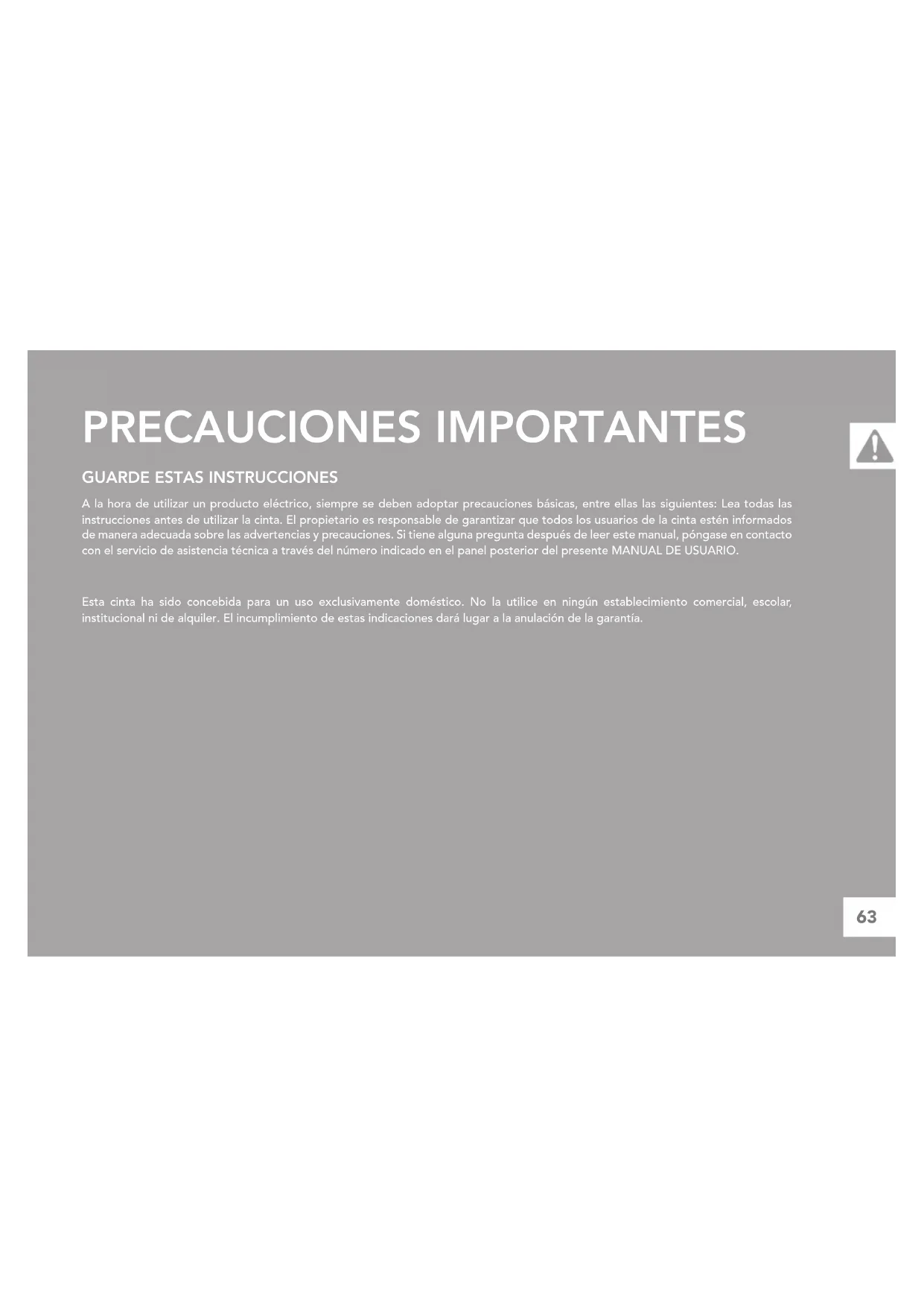 A la hora de utilizar un producto eléctrico, siempre se deben adoptar precauciones básicas, entre ellas las siguientes: Lea todas las instrucciones antes de utilizar la cinta. El propietario es responsable de garantizar que todos los usuarios de la cinta estén informados de manera adecuada sobre las advertencias y precauciones. Si tiene alguna pregunta después de leer este manual, póngase en contacto con el servicio de asistencia técnica a través del número indicado en el panel posterior del presente MANUAL DE USUARIO. Esta cinta ha sido concebida para un uso exclusivamente doméstico. No la utilice en ningún establecimiento comercial, escolar, institucional ni de alquiler. El incumplimiento de estas indicaciones dará lugar a la anulación de la garantía.64 PARA REDUCIR EL RIESGO DE QUEMADURAS, INCENDIOS, DESCARGAS ELÉCTRICAS OLESIONES PERSONALES:
