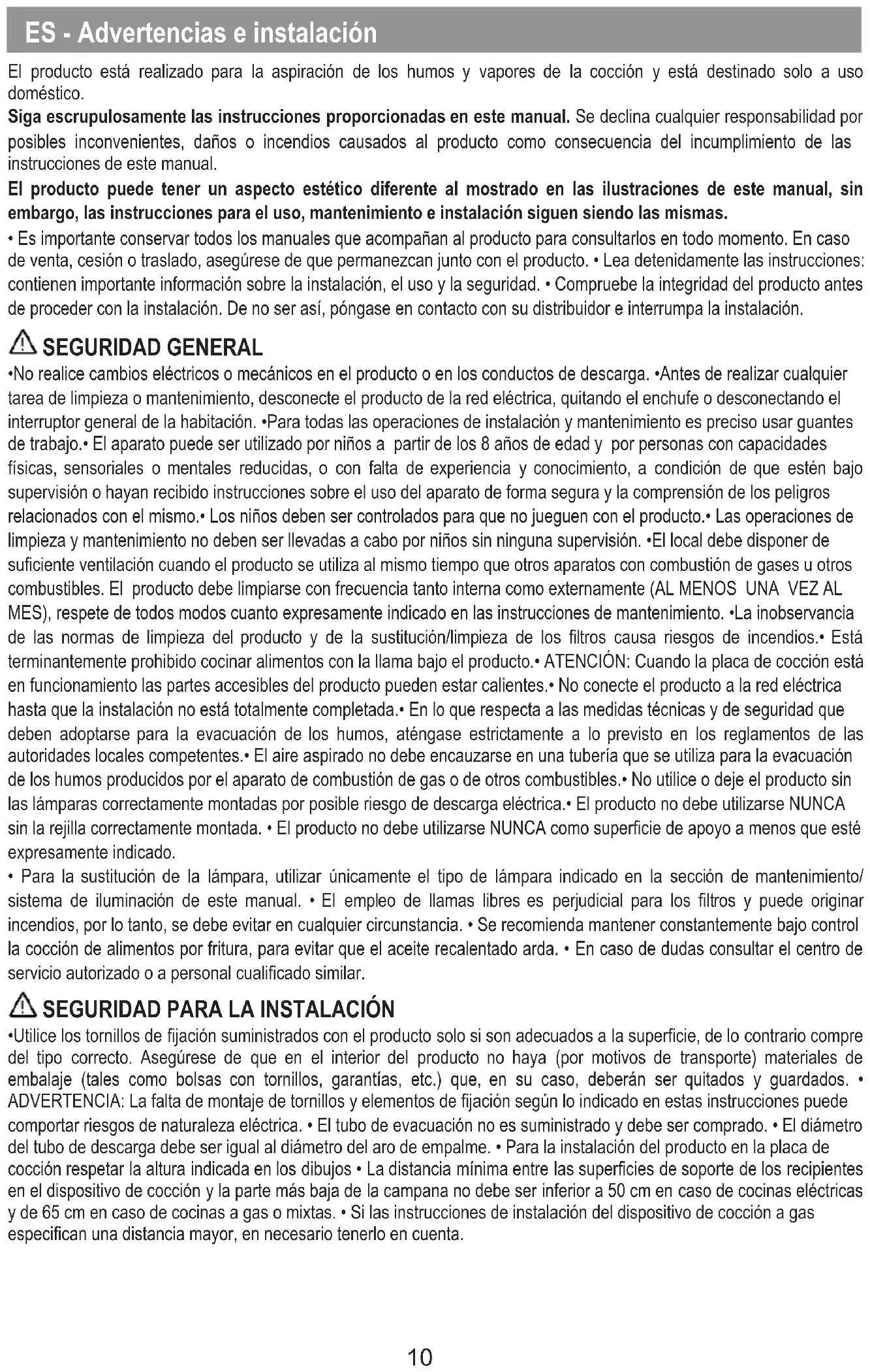 - No realice cambios eléctricos o mecánicos en el producto o en los conductos de descarga. •Antes de realizar cualquier tarea de limpieza o mantenimiento, desconecte el producto de la red eléctrica, quitando el enchufe o desconectando el interruptor general de la habitación. •Para todas las operaciones de instalación y mantenimiento es preciso usar guantes de trabajo.• El aparato puede ser utilizado por niños a partir de los 8 años de edad y por personas con capacidades físicas, sensoriales o mentales reducidas, o con falta de experiencia y conocimiento, a condición de que estén bajo supervisión o hayan recibido instrucciones sobre el uso del aparato de forma segura y la comprensión de los peligros relacionados con el mismo.• Los niños deben ser controlados para que no jueguen con el producto.• Las operaciones de limpieza y mantenimiento no deben ser llevadas a cabo por niños sin ninguna supervisión. •El local debe disponer de suficiente ventilación cuando el producto se utiliza al mismo tiempo que otros aparatos con combustión de gases u otros combustibles. El producto debe limpiarse con frecuencia tanto interna como externamente (AL MENOS UNA VEZ AL MES), respete de todos modos cuanto expresamente indicado en las instrucciones de mantenimiento. •La inobservancia de las normas de limpieza del producto y de la sustitución/limpieza de los filtros causa riesgos de incendios.• Está terminantemente prohibido cocinar alimentos con la llama bajo el producto.• ATENCIÓN: Cuando la placa de cocción está en funcionamiento las partes accesibles del producto pueden estar calientes.• No conecte el producto a la red eléctrica hasta que la instalación no está totalmente completada.• En lo que respecta a las medidas técnicas y de seguridad que deben adoptarse para la evacuación de los humos, aténgase estrictamente a lo previsto en los reglamentos de las autoridades locales competentes.• El aire aspirado no debe encauzarse en una tubería que se utiliza para la evacuación de los humos producidos por el aparato de combustión de gas o de otros combustibles.• No utilice o deje el producto sin las lámparas correctamente montadas por posible riesgo de descarga eléctrica.• El producto no debe utilizarse NUNCA sin la rejilla correctamente montada. • El producto no debe utilizarse NUNCA como superficie de apoyo a menos que esté expresamente indicado.