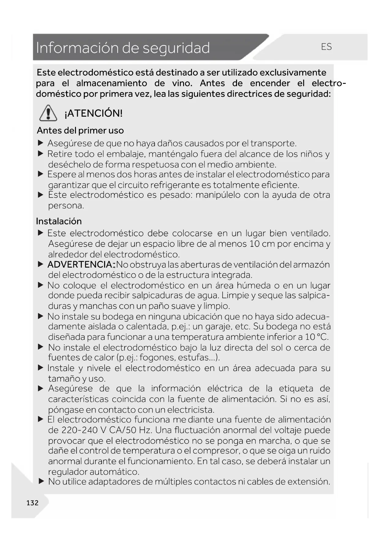 Þöòóõèùìö÷ò Este electrodoméstico está diseñado para uso doméstico y aplicaciones similares, tales como: - Cocinas para personal en tiendas, oficinas y otros entornos de trabajo. - Granjas y el uso por clientes en hoteles, moteles y otros entornos de tipo residencial. - Entornos tipo pensión. - Catering y aplicaciones similares no minoristas. f Para garantizar la conservación segura del vino, siga las instrucciones de uso.
