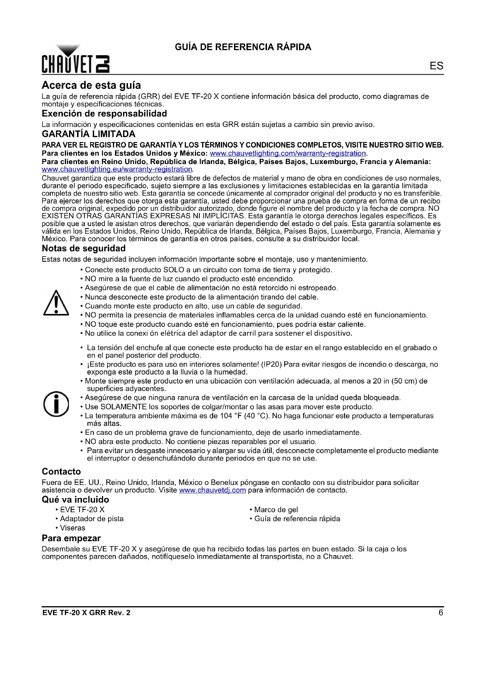 Chauvet garantiza que este producto estará libre de defectos de material y mano de obra en condiciones de uso normales, durante el periodo especificado, sujeto siempre a las exclusiones y limitaciones establecidas en la garantía limitada completa de nuestro sitio web. Esta garantía se concede únicamente al comprador original del producto y no es transferible. Para ejercer los derechos que otorga esta garantía, usted debe proporcionar una prueba de compra en forma de un recibo de compra original, expedido por un distribuidor autorizado, donde figure el nombre del producto y la fecha de compra. NO EXISTEN OTRAS GARANTÍAS EXPRESAS NI IMPLÍCITAS. Esta garantía le otorga derechos legales específicos. Es posible que a usted le asistan otros derechos, que variarán dependiendo del estado o del país. Esta garantía solamente es válida en los Estados Unidos, Reino Unido, República de Irlanda, Bélgica, Países Bajos, Luxemburgo, Francia, Alemania y México. Para conocer los términos de garantía en otros países, consulte a su distribuidor local. Notas de seguridad Estas notas de seguridad incluyen información importante sobre el montaje, uso y mantenimiento. Contacto Fuera de EE. UU., Reino Unido, Irlanda, México o Benelux póngase en contacto con su distribuidor para solicitar asistencia o devolver un producto. Visite www.chauvetdj.com para información de contacto. Qué va incluido Para empezar Desembale su EVE TF-20 X y asegúrese de que ha recibido todas las partes en buen estado. Si la caja o los componentes parecen dañados, notifíqueselo inmediatamente al transportista, no a Chauvet.