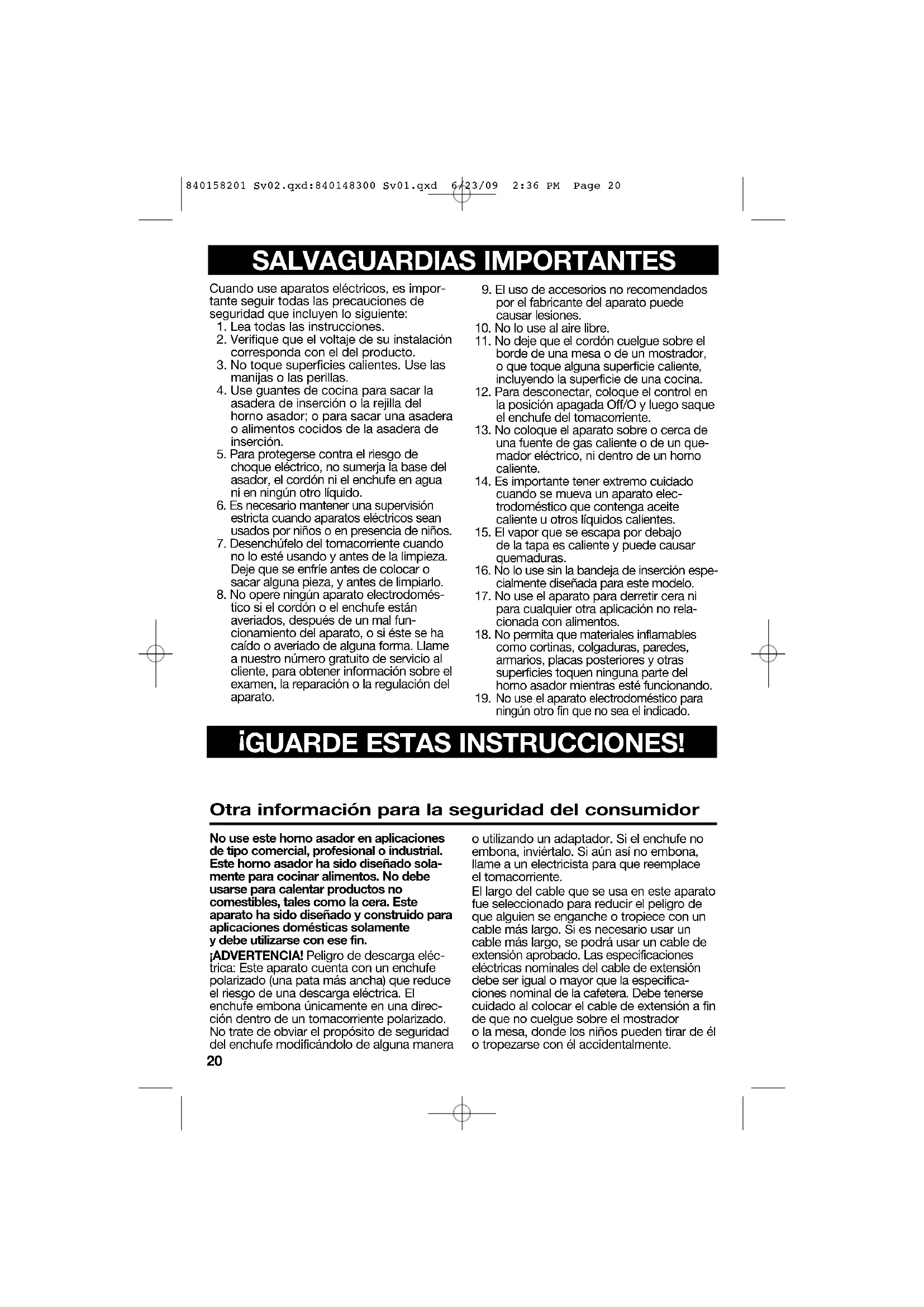 GUARDE ESTAS INSTRUCCIONES! Cuando use aparatos eléctricos, es impor- tante seguir todas las precauciones de seguridad que incluyen lo siguiente: