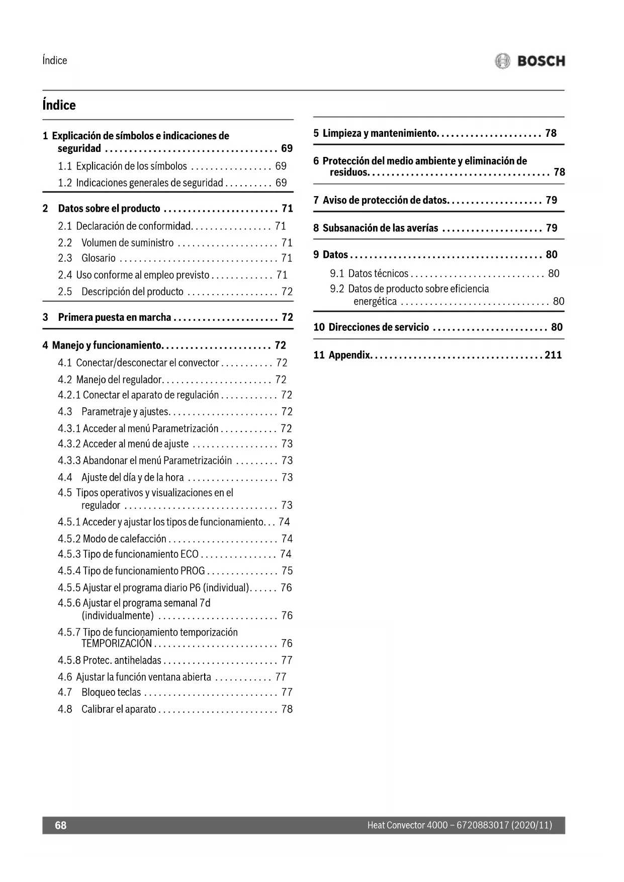 H Seguridad de aparatos eléctricos para el uso doméstico y fines similares Para evitar peligros en elementos termi- nales de calefacción por agua son váli- das las siguientes indicaciones según EN 60335-1 y EN 60335-2,-30: “Niños menores a 3 años deben perma- necer a una distancia segura, a no ser que estén bajo supervisión permanente. Niños a partir de 3 años y menores a 8 años pueden conectar y desconectar el aparato bajo supervisión o después de haber aprendido a usar el aparato de una manera segura y haber entendido los peligros que resultan de ello, con la con- dición de que el aparato se encuentre ubicado o instalado en su posición nor- mal de uso. Niños entre 3 y 8 años no deben enchufar, regular, limpiar ni reali- zar el mantenimiento del aparato.” “Si el cable de conexión a red sufre daños, tendrá que ser sustituido por el fabricante, su servicio técnico u otra persona igualmente calificada para evi- tar peligros.” H Seguridad de aparatos eléctricos para el uso doméstico y fines simi- lares Para evitar peligros en aparatos eléctri- cos son válidas las siguientes normas, según EN 60335-1: “Este aparato puede ser utilizado por niños a partir de 8 años y por personas con capacidades físicas, sensoriales o mentales mermadas o que carezcan de experiencia y conocimiento, siempre y cuando estén bajo la supervisión de otra personas o hayan sido instruidas sobre el manejo seguro del aparato y compren- dan los peligros que de él pueden deri- varse. Los niños no deben jugar con el aparato. Los niños sin supervisión no deben llevar a cabo la limpieza ni el man- tenimiento de usuario.” “Si el cable de conexión a red sufre daños, tendrá que ser sustituido por el fabricante, su servicio técnico u otra persona igualmente cualificada para evi- tar peligros.” H Instalación y uso ▶ No instalar el aparato debajo de un enchufe o cerca de cortinas o de otros materiales combustibles. ▶ No utilizar la calefacción en un entorno directo de una tina de baño, de una ducha o de una piscina. ▶ No utilizar el producto en espacios reducidos, si estos son usados por personas que no están en condicio- nes de salir de la habitación por cuenta propia, a no ser que haya una supervisión constante. H Superficie caliente Algunos componentes de este producto pueden calentarse mucho y causar que- maduras por contacto de la piel. Tener atención especial si se encuentran cerca niños o personas vulnerables.Datos sobre el producto Heat Convector 4000 – 6720883017 (2020/11) H Peligro de sobrecalentamiento, peligro de incendio Para reducir el peligro de incendio: ▶ Mantener una distancia de por lo menos 1 m a la salida de aire al situar el aparato cerca de materiales texti- les, cortinas u otros materiales com- bustibles. ▶ No colocar nada sobre el convector. No cubrir el convector ni subirse so- bre él. ▶ Asegurarse de contar con un libre suministro de calor del convector. ▶ Usar el producto únicamente en una superficie horizontal y estable o fijarla en la pared. H ¡Peligro de muerte por corriente eléctrica! El contacto de un producto o de un cable de conexión defectuoso puede causar una descarga de corriente. ▶ No utilizar el producto después de haber sufrido una caída. ▶ No usar el producto tan pronto cons- tan indicios visibles de un daño. ▶No abrir el producto. ▶ Evitar cualquier tipo de intervencio- nes. ▶ No seguir utilizando el producto y separarlo de la red eléctrica. ▶ Contactar con el servicio técnico. Las direcciones de servicio constan en el cap. 10, pág. 80. -o- ▶ Eliminar correctamente el producto. 2 Datos sobre el producto Las presentes instrucciones contienen información importante para el manejo seguro del aparato de regulación para el Heat Convector 4000usuario de la instalación.Montar el convector únicamente fuera del sector de seguridad (visualizado en gris fig. 3, pág. 211). Para ello:▶ Considerar manual de instalación.