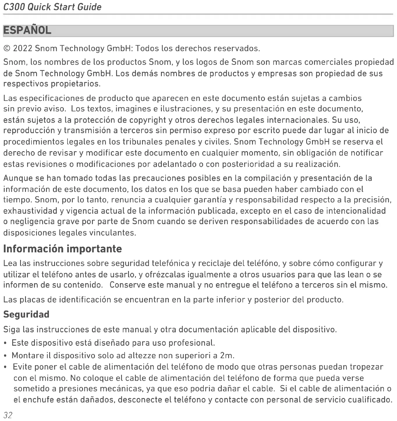 - Microfoni: 6 m icrofoni con beamforming Smaltimento Dispositivo Questo dispositivo è soggetto alla Direttiva Europea 2012/19/EC e non può essere smaltito con i riuti domestici. Se non sapete come smaltire l’apparecchio una volta inutilizzabile, contattate il comune, la nettezza urbana locale, o il vostro rivenditore. Batteria La batteria è soggetto alla Direttiva Europea 2006/66/EC e non può essere buttato tra i normali riuti domestici. Non smaltire le batterie nel fuoco o in un inceneritore. RISCHIO DI ESPLOSIONE! Se non sapete come smaltire la batteria una volta inutilizzabile, contattate il comune, la nettezza urbana locale, o il vostro rivenditore. Per ulteriori informazioni consultare nostra pagina web, https://service.snom.com.com -> Conference solution.32 C300 Quick Start Guide ESPAÑOL © 2022 Snom Technology GmbH: Todos los derechos reservados. Snom, los nombres de los productos Snom, y los logos de Snom son marcas comerciales propiedad de Snom Technology GmbH. Los demás nombres de productos y empresas son propiedad de sus respectivos propietarios. Las especicaciones de producto que aparecen en este documento están sujetas a cambios sin previo aviso. Los textos, imagines e ilustraciones, y su presentación en este documento, están sujetos a la protección de copyright y otros derechos legales internacionales. Su uso, reproducción y transmisión a terceros sin permiso expreso por escrito puede dar lugar al inicio de procedimientos legales en los tribunales penales y civiles. Snom Technology GmbH se reserva el derecho de revisar y modicar este documento en cualquier momento, sin obligación de noticar estas revisiones o modicaciones por adelantado o con posterioridad a su realización. Aunque se han tomado todas las precauciones posibles en la compilación y presentación de la información de este documento, los datos en los que se basa pueden haber cambiado con el tiempo. Snom, por lo tanto, renuncia a cualquier garantía y responsabilidad respecto a la precisión, exhaustividad y vigencia actual de la información publicada, excepto en el caso de intencionalidad o negligencia grave por parte de Snom cuando se deriven responsabilidades de acuerdo con las disposiciones legales vinculantes. Información importante Lea las instrucciones sobre seguridad telefónica y reciclaje del teléfóno, y sobre cómo congurar y utilizar el teléfono antes de usarlo, y ofrézcalas igualmente a otros usuarios para que las lean o se informen de su contenido. Conserve este manual y no entregue el teléfono a terceros sin el mismo. Las placas de identicación se encuentran en la parte inferior y posterior del producto. Seguridad Siga las instrucciones de este manual y otra documentación aplicable del dispositivo.