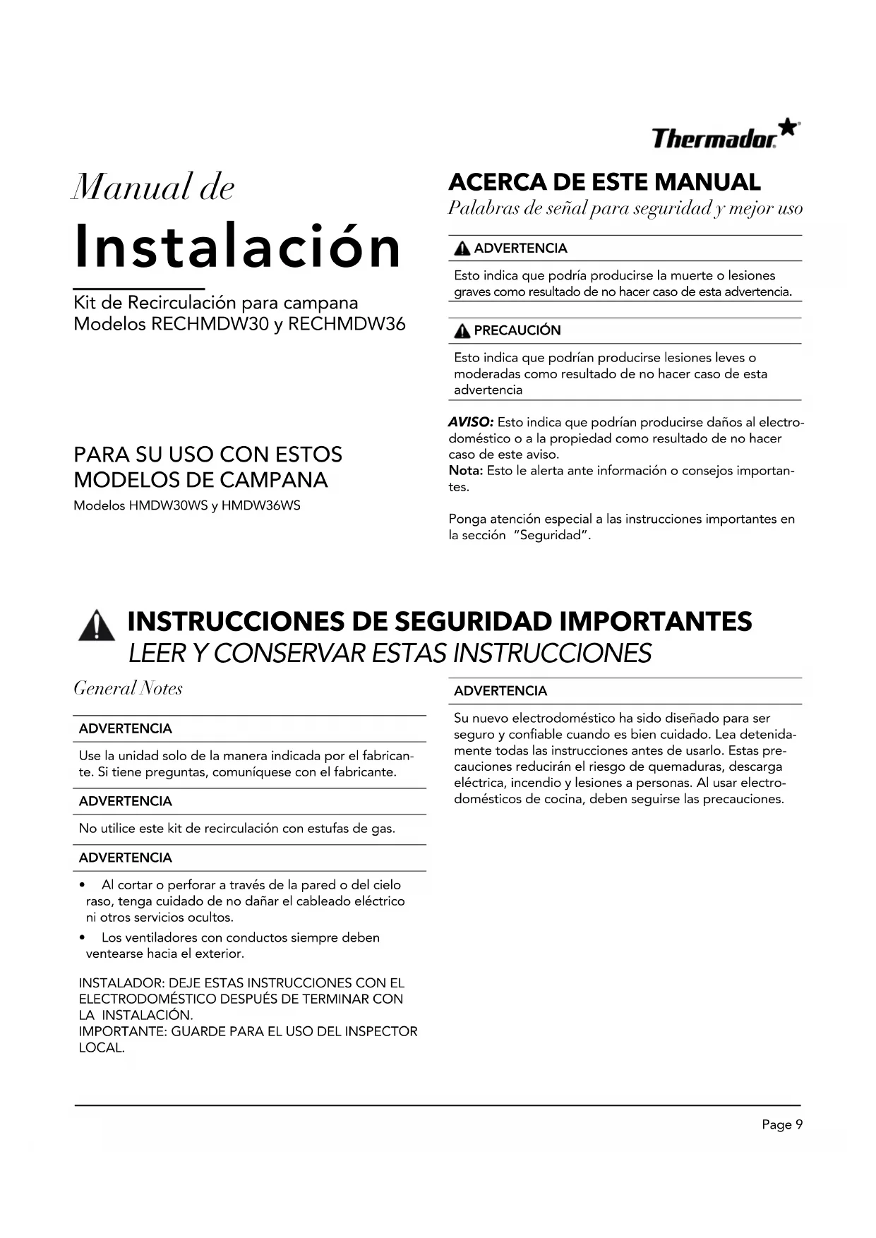 General NotesADVERTENCIAUse la unidad solo de la manera indicada por el fabrican-te. Si tiene preguntas, comuníquese con el fabricante.ADVERTENCIANo utilice este kit de recirculación con estufas de gas.ADVERTENCIA
