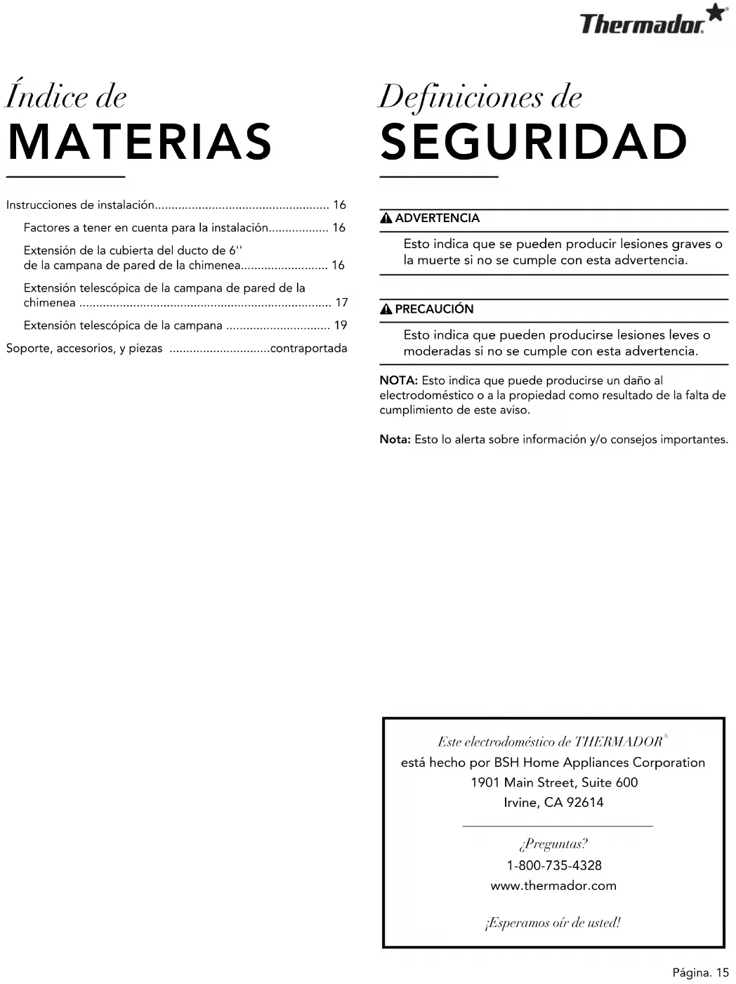 está hecho por BSH Home Appliances Corporation 1901 Main Street, Suite 600 Irvine, CA 92614 ¿Preguntas? 1-800-735-4328 www.thermador.com ¡Esperamos oír de usted! Índice de MATERIAS Instrucciones de instalación.................................................... 16 Factores a tener en cuenta para la instalación.................. 16 Extensión de la cubierta del ducto de 6'' de la campana de pared de la chimenea.......................... 16 Extensión telescópica de la campana de pared de la chimenea ........................................................................... 17 Extensión telescópica de la campana ............................... 19 Soporte, accesorios, y piezas ..............................contraportada Definiciones de SEGURIDAD 9 ADVERTENCIA Esto indica que se pueden producir lesiones graves o la muerte si no se cumple con esta advertencia. 9 PRECAUCIÓN Esto indica que pueden producirse lesiones leves o moderadas si no se cumple con esta advertencia. NOTA: Esto indica que puede producirse un daño al electrodoméstico o a la propiedad como resultado de la falta de cumplimiento de este aviso. Nota: Esto lo alerta sobre información y/o consejos importantes.Página. 16 Instrucciones de instalación Antes de comenzar Antes de empezar, lea atentamente estas instrucciones. 9 PRECAUCIÓN Antes de realizar la instalación, desconectar la alimentación eléctrica en el panel de servicio. Bloquear el panel de servicio para impedir que se conecte accidentalmente la alimentación eléctrica. Advertencia en virtud de la Proposición 65: Este producto puede contener un químico que el Estado de California reconoce como potencialmente cancerígeno o causante de daños reproductivos. Por tanto, su producto debe llevar en su embalaje la siguiente etiqueta de conformidad con la legislación de California: IMPORTANTE: Fije la campana a la pared antes de instalar el alargador de conducto. Vea la Instrucciones de instalación para la ventilación antes de instalar un alargador. Remoción de la película protectora