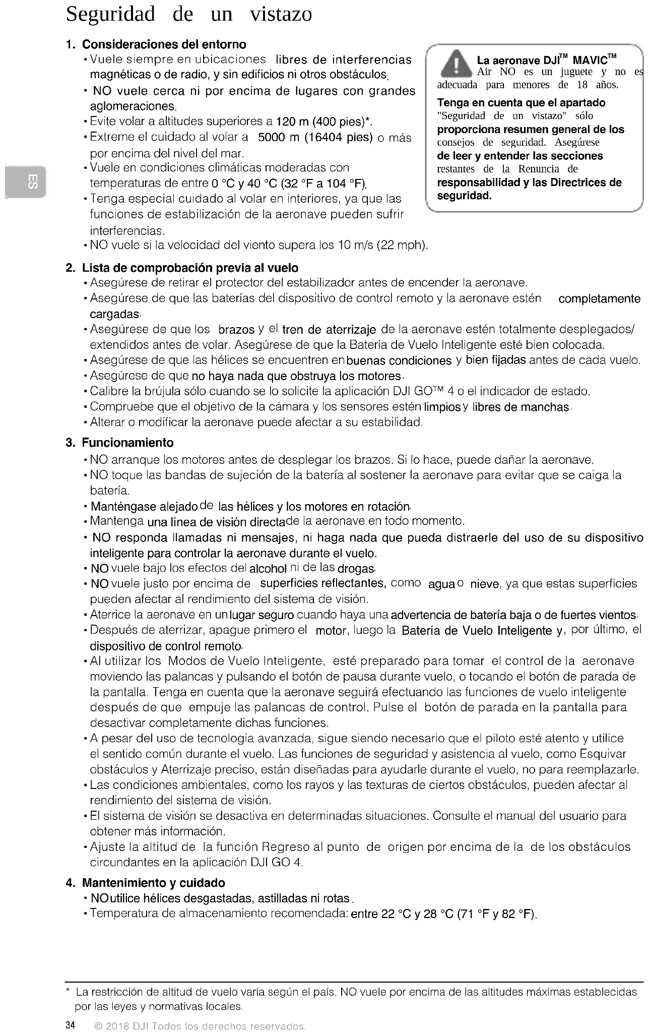 © 2018 DJI Todos los derechos reservados. Antesdecomenzar Los siguientes documentos se han elaborado para ayudarle a utilizar con seguridad y sacar el máximo partido de la aeronave: Contenido del embalaje Renuncia de responsabilidad y directrices de seguridad Directrices de seguridad de la Batería de Vuelo Inteligente Guía de inicio rápido Manual del usuario Compruebe todas las piezas incluidas que se mencionan en la sección Contenido del embalaje y lea las Directrices de seguridad antes del vuelo. A continuación, prepárese para su primer vuelo utilizando la Guía de inicio rápido y vea todos los videotutoriales del sitio web ocial de DJI (http://www.dji.com). Si tiene alguna duda, consulte el Manual del usuario en la aplicación o en el sitio web ocial de DJI para obtener información más exhaustiva. Asegúrese de comprender en su totalidad las funciones de cada pieza individual, los requisitos de condiciones de vuelo, las funciones/sistemas de advertencia por imprevistos clave y todas las normativas de las autoridades antes de cada vuelo. Si tiene alguna pregunta o problema durante el montaje, mantenimiento o uso de este producto, póngase en contacto con DJI o con un distribuidor autorizado de DJI. Piezasindividuales Acercadelaspiezasoriginalesyfuncionales Paraevitarelfuncionamientoincorrectodeloscomponentes,lesionesgravesydañosmateriales,respete las siguientes reglas:1.UtilicesólopiezasoriginalesdeDJIopiezascerticadasporDJI.LaspiezasnoautorizadasopiezasdefabricantesnocerticadosporDJIpuedenproduciraveríasenelsistemayponerenpeligro la seguridad.2.Asegúresedequenohayaobjetosextraños(comoagua,aceite,tierra,arena,etc.)dentrodelaaeronave o de sus componentes. 3.Asegúresedequelaaeronaveysuscomponentes,incluidos,entreotros,lacámara,elestabilizador,labrújula,elsistemadepropulsiónylabatería,esténenbuenestado,nopresentendañosyfuncionencorrectamente.Consultelasseccionesrestantesdeestedocumentoparaobtenermásdetallessobrecómogarantizarlafuncionalidaddeestoscomponentes.4.NOmodifiquenialterelaaeronave,suscomponentesnisuspiezas.Lasmodificacionesnoautorizadaspuedenocasionarfallosyafectaralfuncionamientoyseguridaddelaaeronave. Control remoto 1. Asegúrese de que el control remoto esté completamente cargado antes de cada vuelo.2. Si el control remoto está encendido y NO se ha utilizado durante 5 minutos, sonará una alerta. Después de 10 minutos, se apagará automáticamente. Mueva las palancas o realice alguna otra acción para cancelar la alerta.3. Ajuste la abrazadera del soporte para dispositivo móvil para que el dispositivo móvil quede sujeto rmemente.4. Asegúrese de que el soporte para dispositivo móvil está rmemente colocado en su lugar y no se desliza.5. Asegúrese de que las antenas del control remoto estén desplegadas y ajustadas en la posición adecuada para conseguir una calidad de transmisión óptima.6. Repare o sustituya el control remoto si está dañado. Una antena de control remoto dañada reducirá considerablemente el rendimiento.7. La vinculación es necesaria si desea sustituir el control remoto o el receptor, o agregar un nuevo control remoto. Consulte el Manual del usuario para obtener detalles.8. Cargue completamente la batería al menos una vez cada tres meses para conservarla en buen estado. 9. Compruebe que las palancas estén bien montadas.ES © 2018 DJI Todos los derechos reservados.