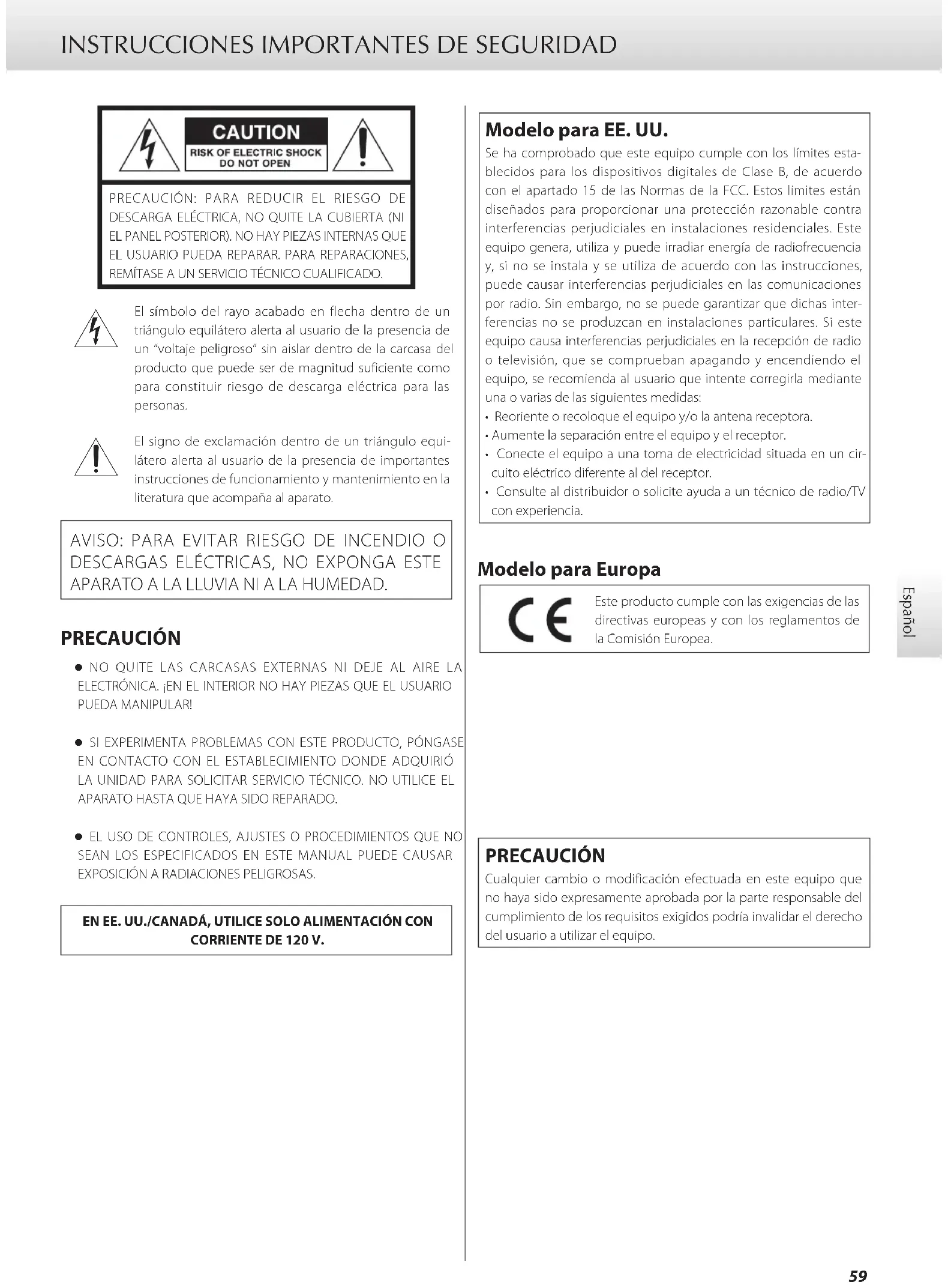 PRECAUCIÓN: PARA REDUCIR EL RIESGO DE DESCARGA ELÉCTRICA, NO QUITE LA CUBIERTA (NI EL PANEL POSTERIOR). NO HAY PIEZAS INTERNAS QUE EL USUARIO PUEDA REPARAR. PARA REPARACIONES, REMÍTASE A UN SERVICIO TÉCNICO CUALIFICADO. El símbolo del rayo acabado en flecha dentro de un triángulo equilátero alerta al usuario de la presencia de un “voltaje peligroso” sin aislar dentro de la carcasa del producto que puede ser de magnitud suficiente como para constituir riesgo de descarga eléctrica para las personas. El signo de exclamación dentro de un triángulo equi-látero alerta al usuario de la presencia de importantes instrucciones de funcionamiento y mantenimiento en la literatura que acompaña al aparato. AVISO: PARA EVITAR RIESGO DE INCENDIO O