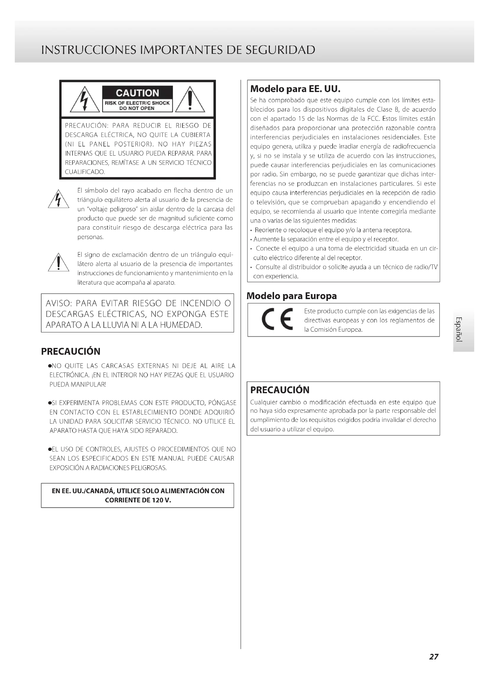 PRECAUCIÓN: PARA REDUCIR EL RIESGO DE DESCARGA ELÉCTRICA, NO QUITE LA CUBIERTA (NI EL PANEL POSTERIOR). NO HAY PIEZAS INTERNAS QUE EL USUARIO PUEDA REPARAR. PARA REPARACIONES, REMÍTASE A UN SERVICIO TÉCNICO CUALIFICADO. El símbolo del rayo acabado en flecha dentro de un triángulo equilátero alerta al usuario de la presencia de un “voltaje peligroso” sin aislar dentro de la carcasa del producto que puede ser de magnitud suficiente como para constituir riesgo de descarga eléctrica para las personas. El signo de exclamación dentro de un triángulo equi-látero alerta al usuario de la presencia de importantes instrucciones de funcionamiento y mantenimiento en la literatura que acompaña al aparato. AVISO: PARA EVITAR RIESGO DE INCENDIO O