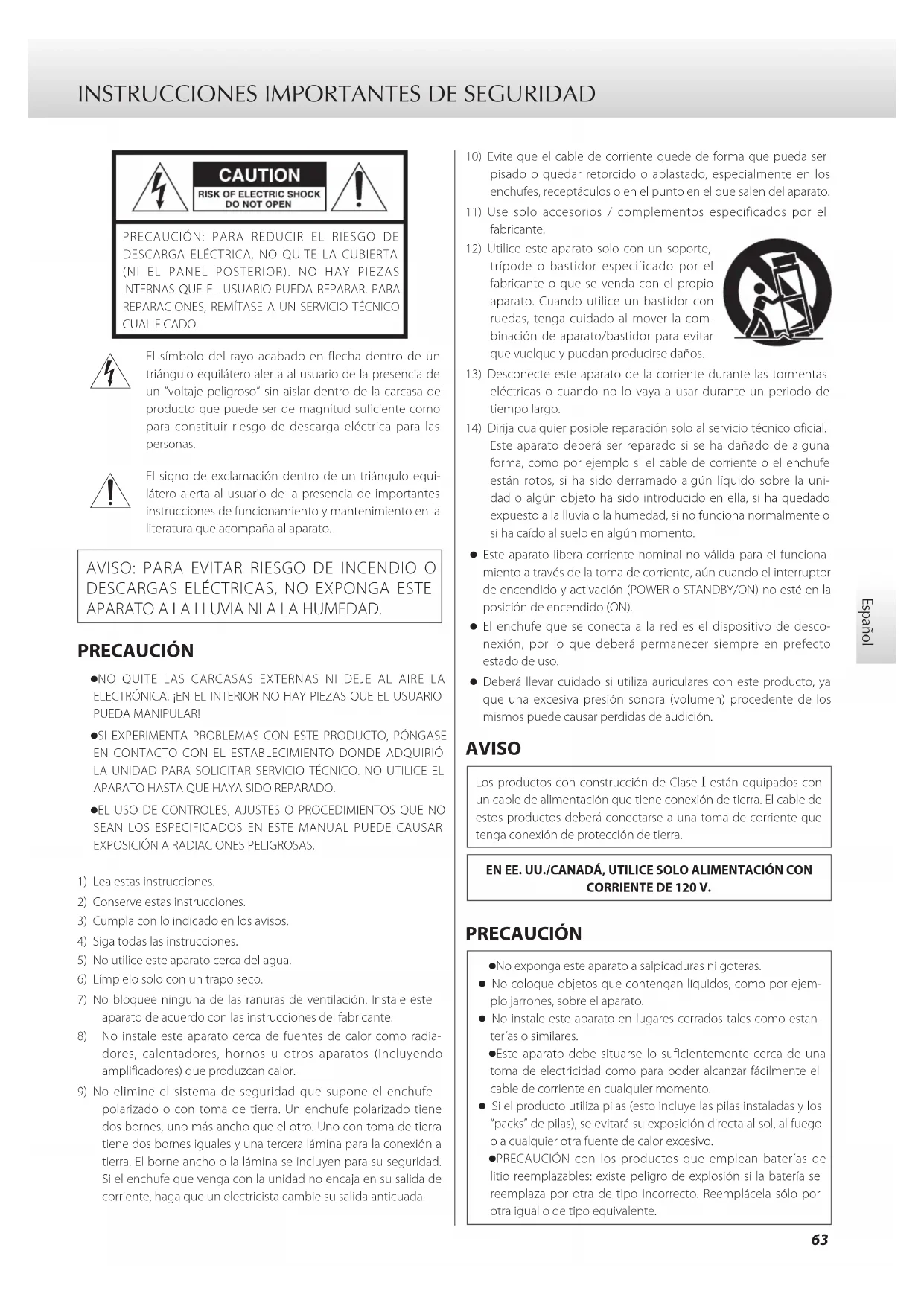 PRECAUCIÓN: PARA REDUCIR EL RIESGO DE DESCARGA ELÉCTRICA, NO QUITE LA CUBIERTA (NI EL PANEL POSTERIOR). NO HAY PIEZAS INTERNAS QUE EL USUARIO PUEDA REPARAR. PARA REPARACIONES, REMÍTASE A UN SERVICIO TÉCNICO CUALIFICADO. El símbolo del rayo acabado en flecha dentro de un triángulo equilátero alerta al usuario de la presencia de un “voltaje peligroso” sin aislar dentro de la carcasa del producto que puede ser de magnitud suficiente como para constituir riesgo de descarga eléctrica para las personas. El signo de exclamación dentro de un triángulo equi-látero alerta al usuario de la presencia de importantes instrucciones de funcionamiento y mantenimiento en la literatura que acompaña al aparato. AVISO: PARA EVITAR RIESGO DE INCENDIO O