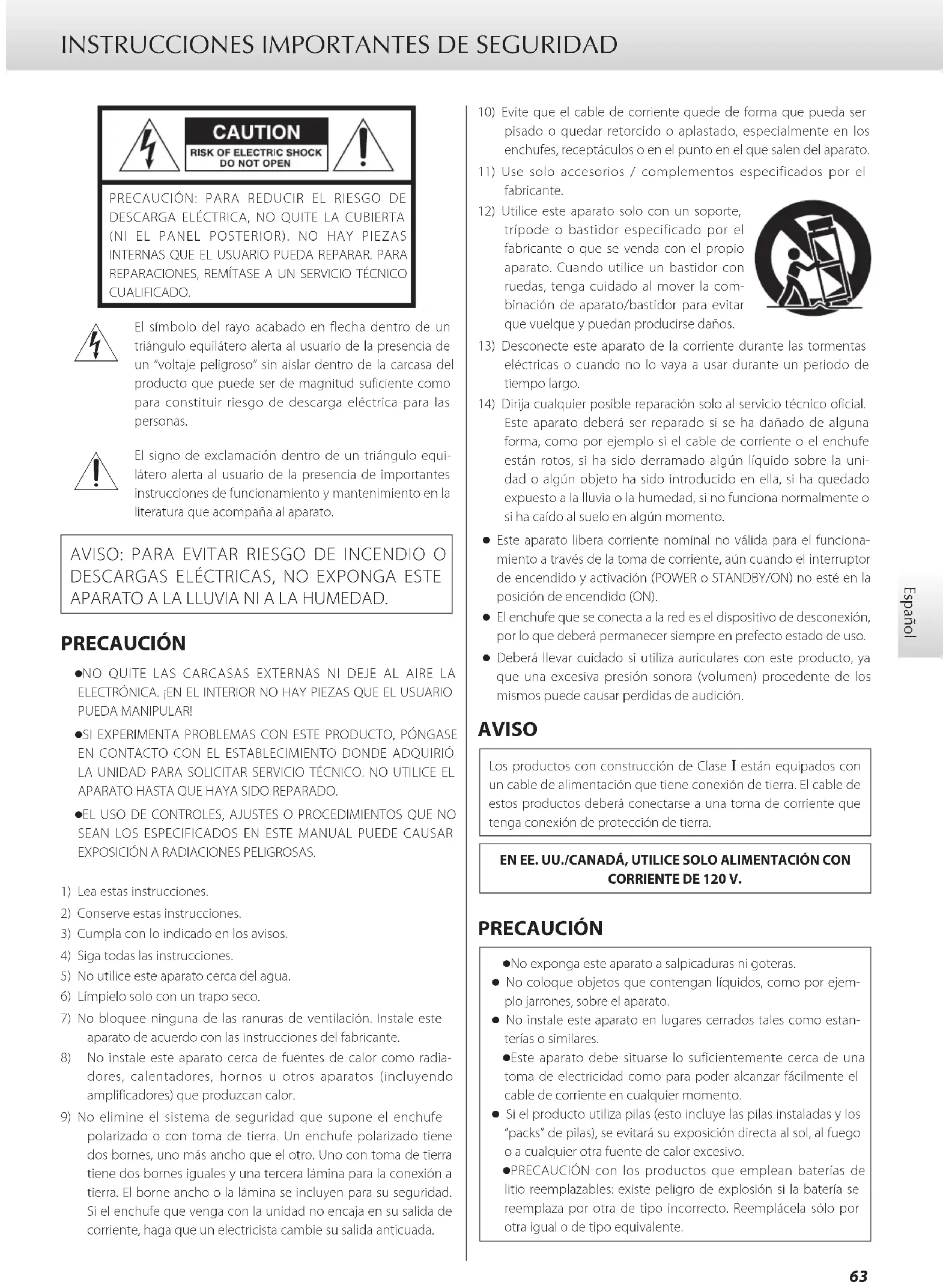 PRECAUCIÓN: PARA REDUCIR EL RIESGO DE DESCARGA ELÉCTRICA, NO QUITE LA CUBIERTA (NI EL PANEL POSTERIOR). NO HAY PIEZAS INTERNAS QUE EL USUARIO PUEDA REPARAR. PARA REPARACIONES, REMÍTASE A UN SERVICIO TÉCNICO CUALIFICADO. El símbolo del rayo acabado en flecha dentro de un triángulo equilátero alerta al usuario de la presencia de un “voltaje peligroso” sin aislar dentro de la carcasa del producto que puede ser de magnitud suficiente como para constituir riesgo de descarga eléctrica para las personas. El signo de exclamación dentro de un triángulo equi-látero alerta al usuario de la presencia de importantes instrucciones de funcionamiento y mantenimiento en la literatura que acompaña al aparato. AVISO: PARA EVITAR RIESGO DE INCENDIO O