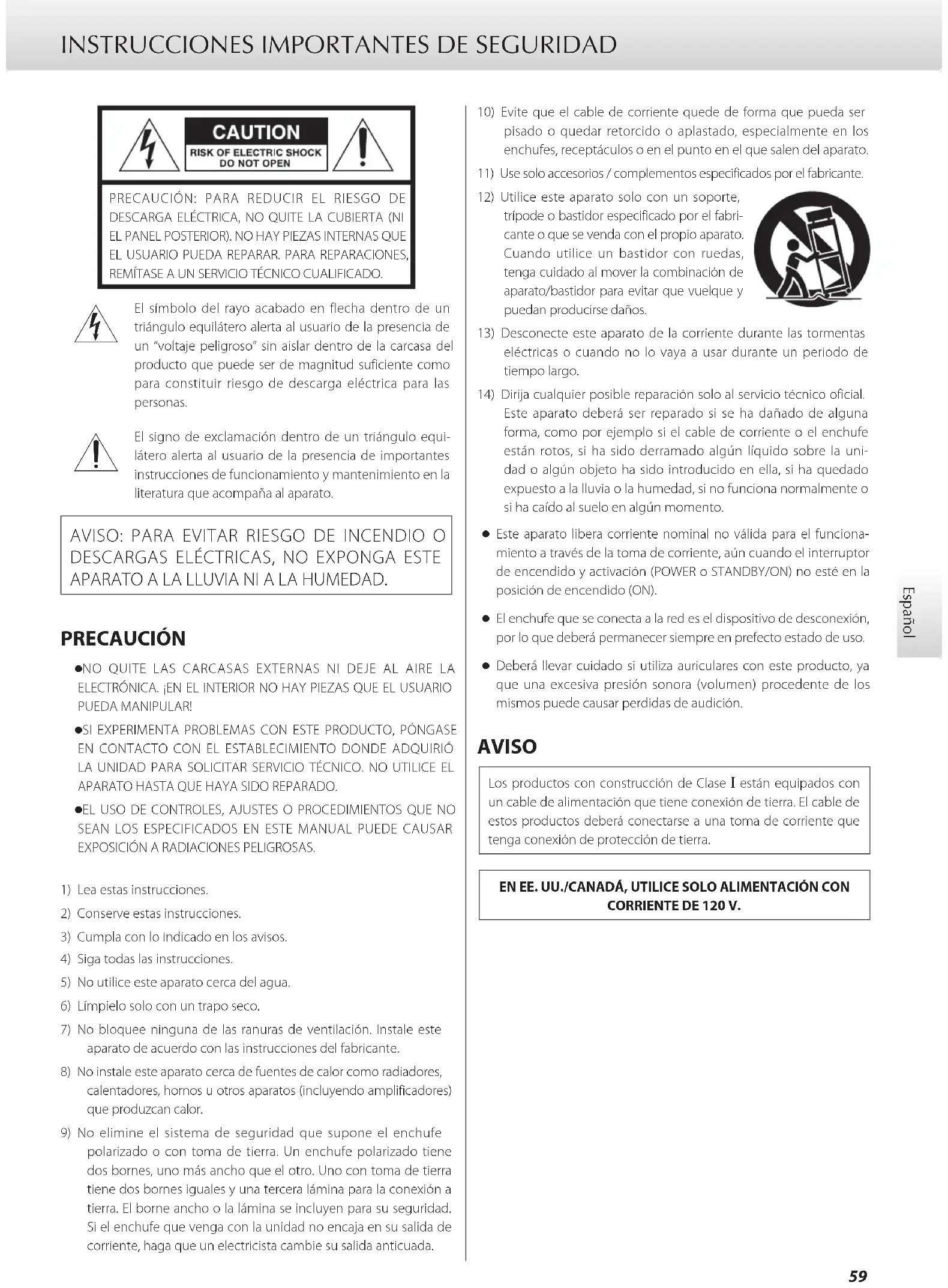 PRECAUCIÓN: PARA REDUCIR EL RIESGO DE DESCARGA ELÉCTRICA, NO QUITE LA CUBIERTA (NI EL PANEL POSTERIOR). NO HAY PIEZAS INTERNAS QUE EL USUARIO PUEDA REPARAR. PARA REPARACIONES, REMÍTASE A UN SERVICIO TÉCNICO CUALIFICADO. El símbolo del rayo acabado en flecha dentro de un triángulo equilátero alerta al usuario de la presencia de un “voltaje peligroso” sin aislar dentro de la carcasa del producto que puede ser de magnitud suficiente como para constituir riesgo de descarga eléctrica para las personas. El signo de exclamación dentro de un triángulo equi-látero alerta al usuario de la presencia de importantes instrucciones de funcionamiento y mantenimiento en la literatura que acompaña al aparato. AVISO: PARA EVITAR RIESGO DE INCENDIO O