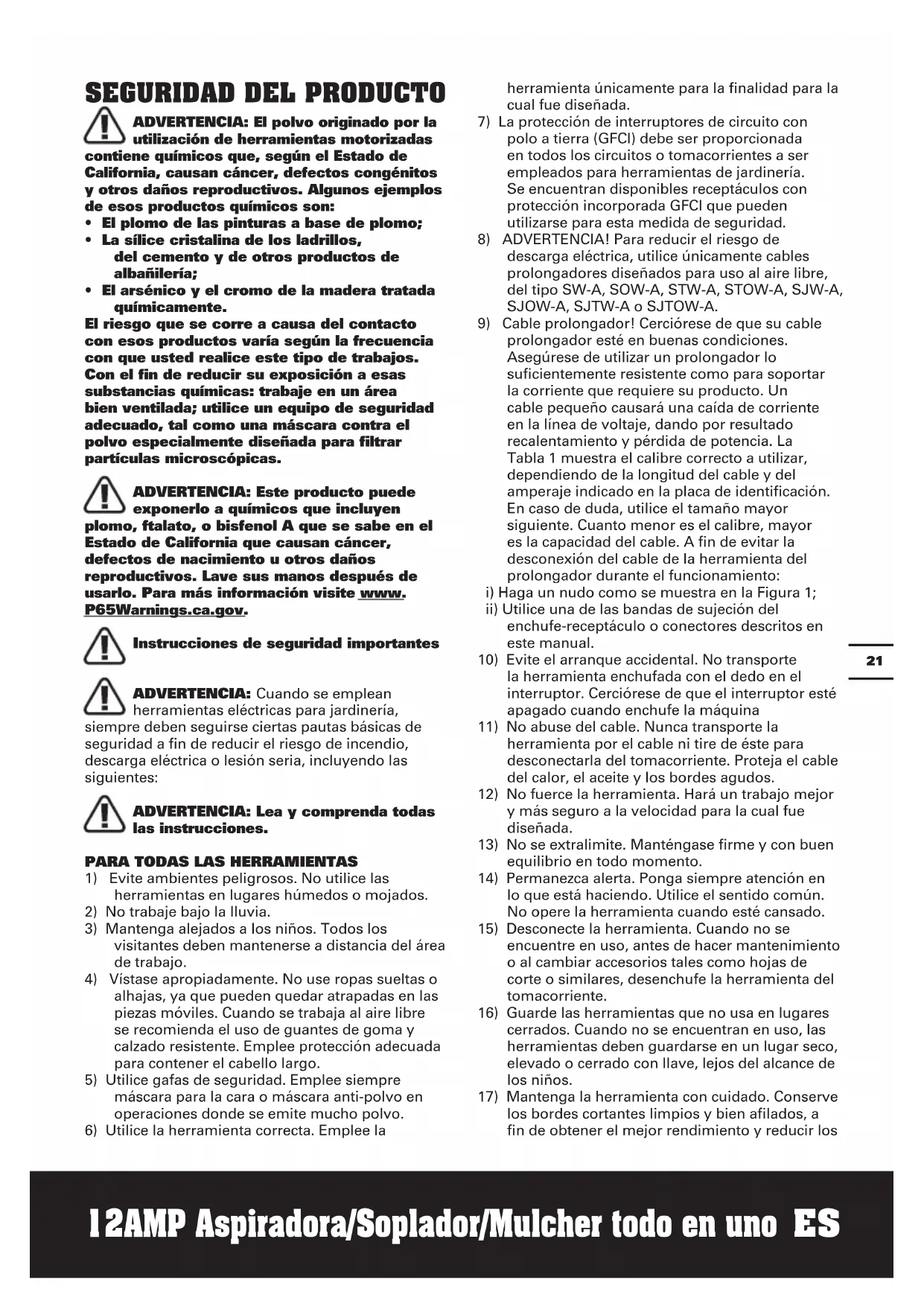 - El arsénico y el cromo de la madera tratada químicamente. El riesgo que se corre a causa del contacto con esos productos varía según la frecuencia con que usted realice este tipo de trabajos. Con el fin de reducir su exposición a esas substancias químicas: trabaje en un área bien ventilada; utilice un equipo de seguridad adecuado, tal como una máscara contra el polvo especialmente diseñada para filtrar partículas microscópicas. ADVERTENCIA: Este producto puede exponerlo a químicos que incluyen plomo, ftalato, o bisfenol A que se sabe en el Estado de California que causan cáncer, defectos de nacimiento u otros daños reproductivos. Lave sus manos después de usarlo. Para más información visite www. P65Warnings.ca.gov. Instrucciones de seguridad importantes ADVERTENCIA: Cuando se emplean herramientas eléctricas para jardinería, siempre deben seguirse ciertas pautas básicas de seguridad a fin de reducir el riesgo de incendio, descarga eléctrica o lesión seria, incluyendo las siguientes: ADVERTENCIA: Lea y comprenda todas las instrucciones.