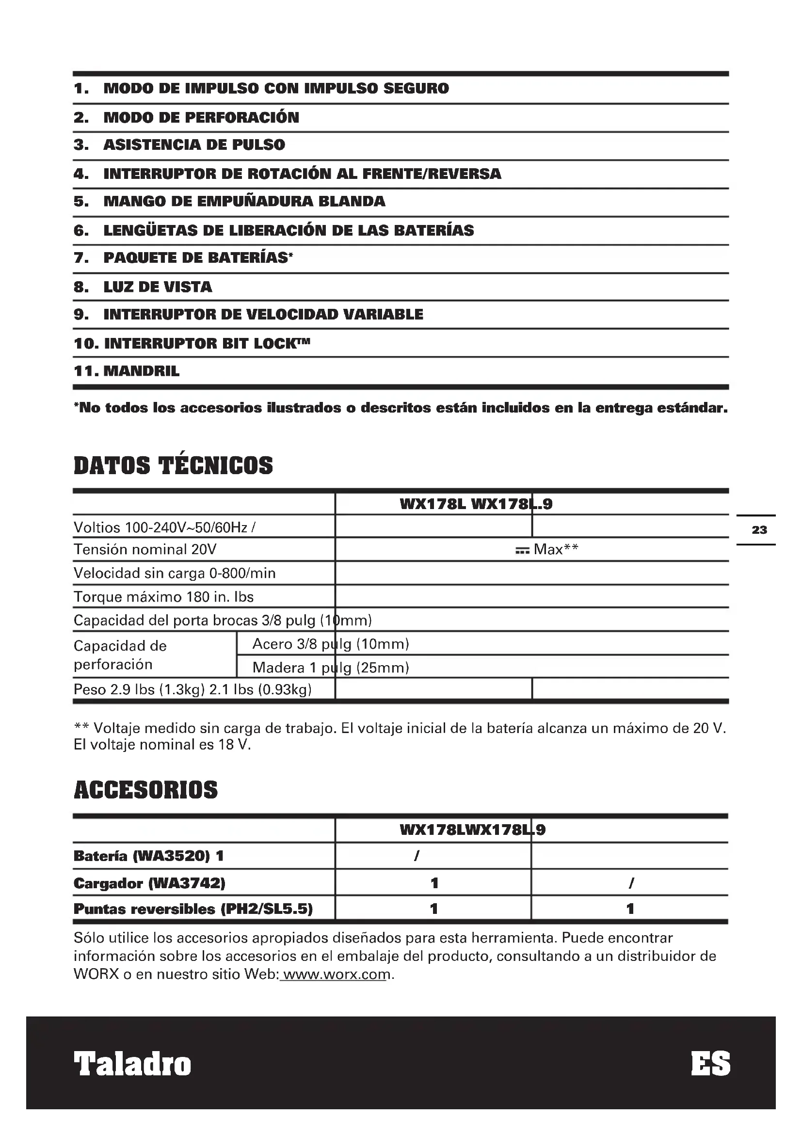 WX178L WX178L.9 Voltios 100-240V~50/60Hz / Tensión nominal 20V Max** Velocidad sin carga 0-800/min Torque máximo 180 in. lbs Capacidad del porta brocas 3/8 pulg (10mm) Capacidad de perforación Acero 3/8 pulg (10mm) Madera 1 pulg (25mm) Peso 2.9 lbs (1.3kg) 2.1 lbs (0.93kg) ** Voltaje medido sin carga de trabajo. El voltaje inicial de la batería alcanza un máximo de 20 V. El voltaje nominal es 18 V. ACCESORIOS WX178L WX178L.9 Batería (WA3520) 1 / Cargador (WA3742) 1 / Puntas reversibles (PH2/SL5.5) 1 1 Sólo utilice los accesorios apropiados diseñados para esta herramienta. Puede encontrar información sobre los accesorios en el embalaje del producto, consultando a un distribuidor de WORX o en nuestro sitio Web: www.worx.com.