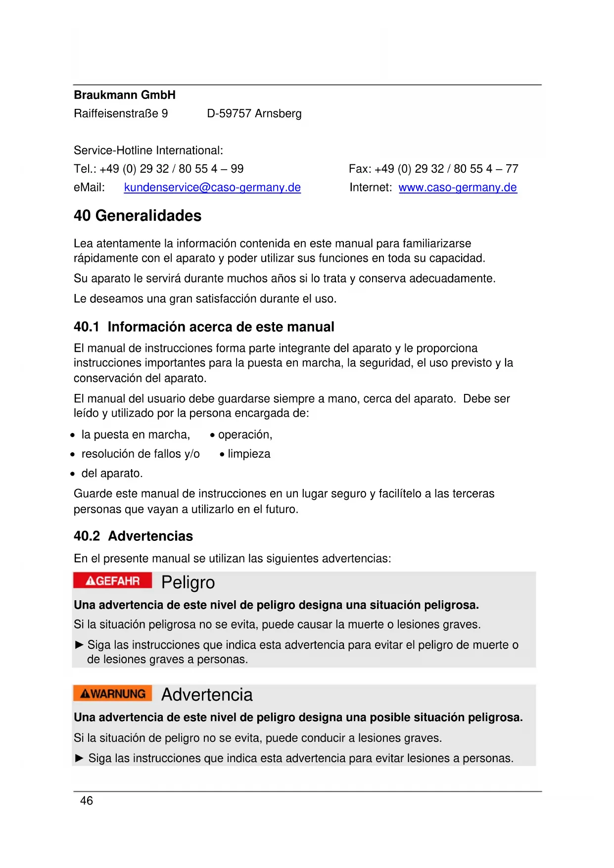 Esta documentación está protegida por los derechos de autor. Braukmann GmbH se reserva todos los derechos, incluida la reproducción fotomecánica, la publicación y distribución mediante procedimientos especiales (p.ej. procesamiento de datos, soporte de datos y redes de datos), ya sea en su totalidad o en parte. Válido salvo errores de contenido y modificaciones técnicas 41 Seguridad En este capítulo obtendrá importantes instrucciones de seguridad sobre la manipulación del aparato. Este aparato cumple la normativa de seguridad vigente. No obstante, el uso indebido puede causar lesiones a personas y daños materiales.48