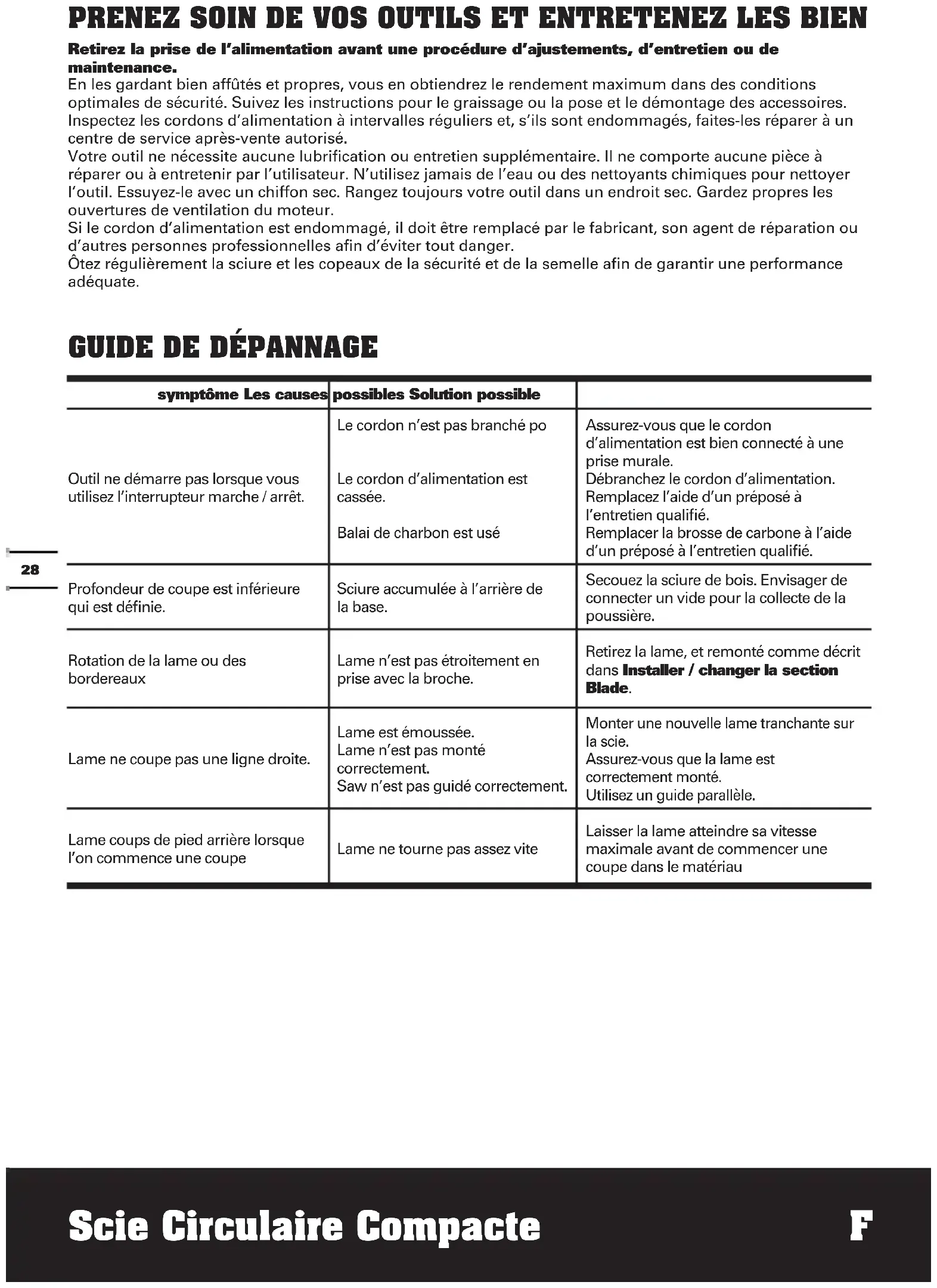 Problema Causa posible Solución posible La herramienta no arranca al utilizar el interruptor de encendido/apagado. Cable de alimentación no enchufado. Cable de alimentación dañado. El cepillo de carbono se encuentra desgastado. Asegúrese de que el cable de alimentación se encuentre conectado de forma correcta a un tomacorriente en funcionamiento. Desenchufe el cable de alimentación. Solicite el reemplazo a una persona de mantenimiento calificada. Solicite el reemplazo del cepillo de carbono a una persona de mantenimiento calificada. La profundidad de corte es inferior a la establecida. Aserrín acumulado en la parte posterior de la base. Extraiga el aserrín. Considere conectar una aspiradora para realizar la recolección del polvo. La hoja da vueltas o se resbala. La hoja no se encuentra acoplada de forma estrecha en el eje. Extraiga la hoja y vuelva a ensamblarla tal como se describe en la sección