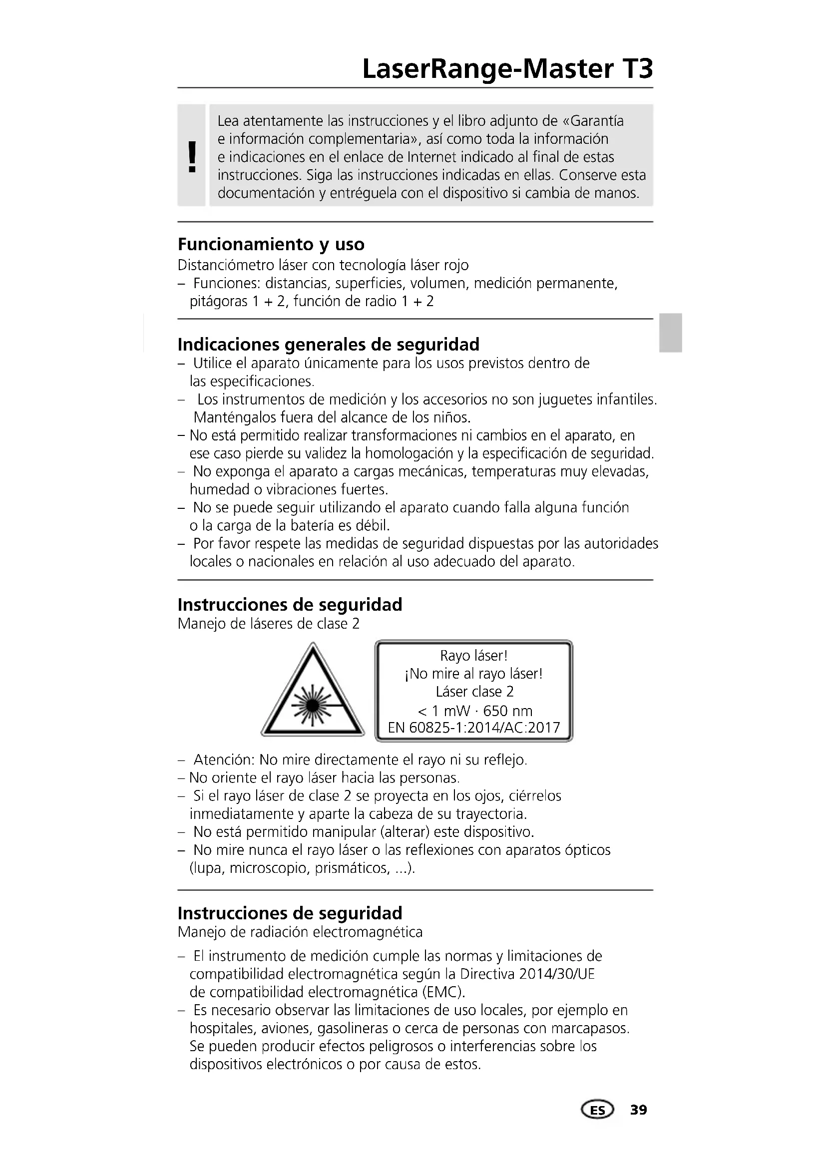No está permitido realizar transformaciones ni cambios en el aparato, en ese caso pierde su validez la homologación y la especicación de seguridad. – No exponga el aparato a cargas mecánicas, temperaturas muy elevadas, humedad o vibraciones fuertes. – No se puede seguir utilizando el aparato cuando falla alguna función o la carga de la batería es débil. – Por favor respete las medidas de seguridad dispuestas por las autoridades locales o nacionales en relación al uso adecuado del aparato. – Atención: No mire directamente el rayo ni su reejo. – No oriente el rayo láser hacia las personas. – Si el rayo láser de clase 2 se proyecta en los ojos, ciérrelos inmediatamente y aparte la cabeza de su trayectoria. – No está permitido manipular (alterar) este dispositivo. – No mire nunca el rayo láser o las reexiones con aparatos ópticos (lupa, microscopio, prismáticos, ...). Instrucciones de seguridad Manejo de láseres de clase 2 Rayo láser! ¡No mire al rayo láser! Láser clase 2 < 1 mW · 650 nm EN 60825-1:2014/AC:2017 Instrucciones de seguridad Manejo de radiación electromagnética – El instrumento de medición cumple las normas y limitaciones de compatibilidad electromagnética según la Directiva 2014/30/UE de compatibilidad electromagnética (EMC). – Es necesario observar las limitaciones de uso locales, por ejemplo en hospitales, aviones, gasolineras o cerca de personas con marcapasos. Se pueden producir efectos peligrosos o interferencias sobre los dispositivos electrónicos o por causa de estos. Lea atentamente las instrucciones y el libro adjunto de «Garantía e información complementaria», así como toda la información e indicaciones en el enlace de Internet indicado al final de estas instrucciones. Siga las instrucciones indicadas en ellas. Conserve esta documentación y entréguela con el dispositivo si cambia de manos.