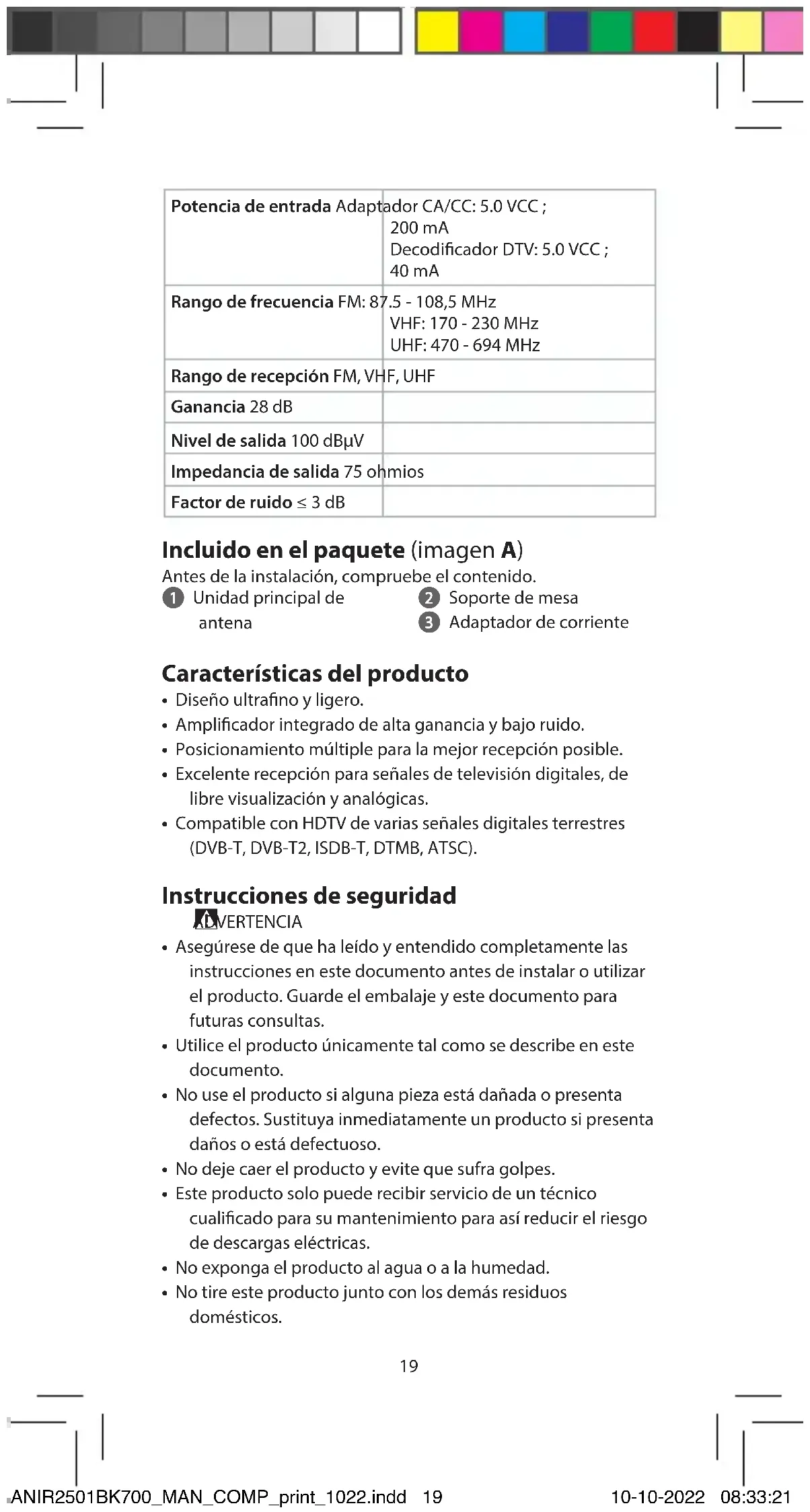 Guía de inicio rápido Antena de TV para interiores ANIR2501BK700 Uso previsto por el fabricante Este producto es una antena que se puede utilizar con un televisor o un decodicador que admita alimentación por cable coaxial. Se trata de una antena especialmente diseñada para la recepción de emisiones de televisión digital terrestre. El producto está diseñado únicamente para uso en interiores. Datos técnicos Producto Antena de TV para interiores Número de artículo ANIR2501BK700 ANIR2501BK700_MAN_COMP_print_1022.indd 18ANIR2501BK700_MAN_COMP_print_1022.indd 18 10-10-2022 08:33:2110-10-2022 08:33:2119 Potencia de entrada Adaptador CA/CC: 5.0 VCC ; 200 mA Decodicador DTV: 5.0 VCC ; 40 mA Rango de frecuencia FM: 87.5 - 108,5 MHz VHF: 170 - 230 MHz UHF: 470 - 694 MHz Rango de recepción FM, VHF, UHF Ganancia 28 dB Nivel de salida 100 dBµV Impedancia de salida 75 ohmios Factor de ruido ≤ 3 dB Incluido en el paquete (imagen A) Antes de la instalación, compruebe el contenido. 1 Unidad principal de antena 2 Soporte de mesa 3 Adaptador de corriente Características del producto