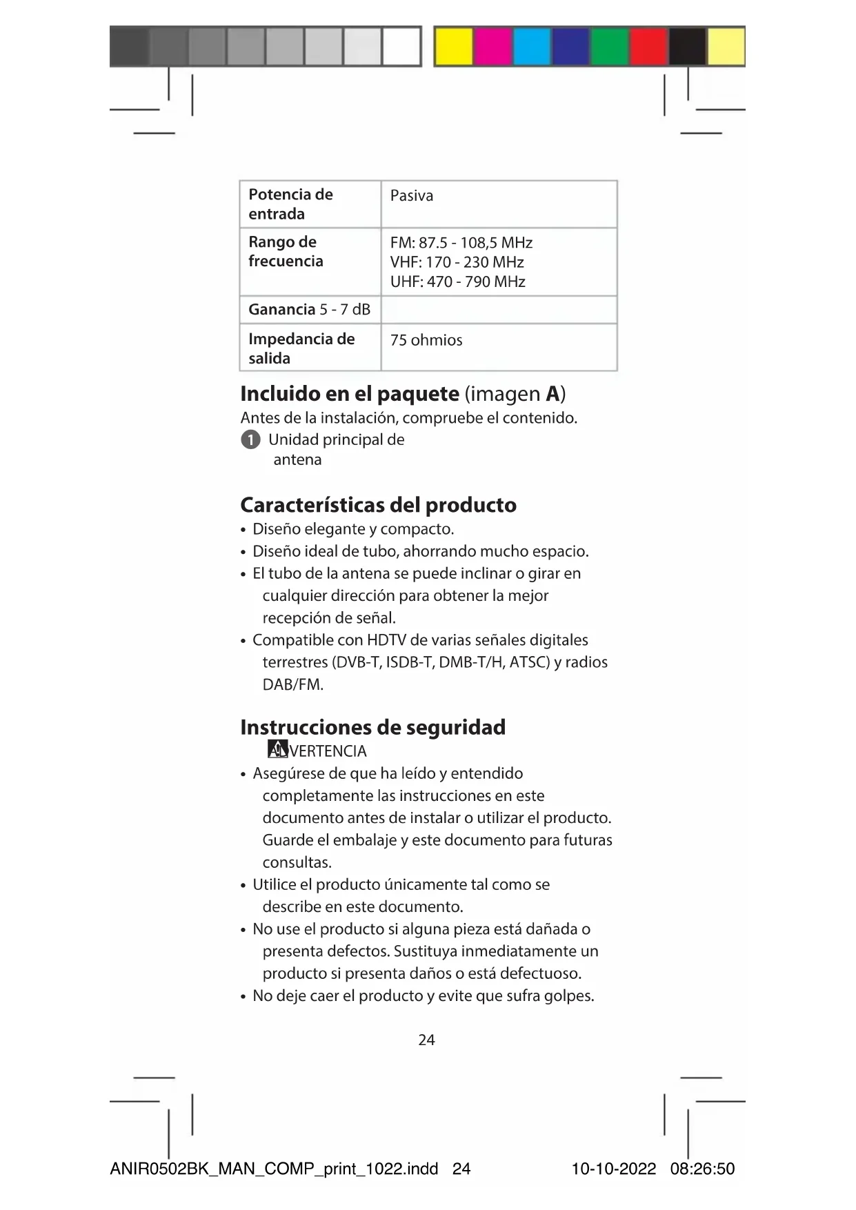 Guía de inicio rápido Antena de TV para interiores ANIR0502BK Uso previsto por el fabricante Este producto es una antena que se puede utilizar con un televisor o un decodicador que admita alimentación por cable coaxial. Se trata de una antena especialmente diseñada para la recepción de emisiones de televisión digital terrestre. El producto está diseñado únicamente para uso en interiores. Datos técnicos Producto Antena de TV para interiores Número de artículo ANIR0502BK ANIR0502BK_MAN_COMP_print_1022.indd 23ANIR0502BK_MAN_COMP_print_1022.indd 23 10-10-2022 08:26:5010-10-2022 08:26:5024 Potencia de entrada Pasiva Rango de frecuencia FM: 87.5 - 108,5 MHz VHF: 170 - 230 MHz UHF: 470 - 790 MHz Ganancia 5 - 7 dB Impedancia de salida 75 ohmios Incluido en el paquete (imagen A) Antes de la instalación, compruebe el contenido. 1 Unidad principal de antena Características del producto