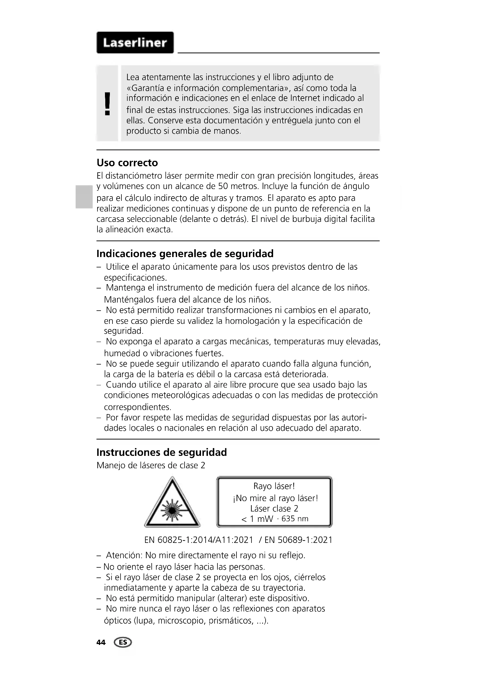 - 635 nm EN 60825-1:2014/A11:2021 / EN 50689-1:2021 – Utilice el aparato únicamente para los usos previstos dentro de las especicaciones. – Mantenga el instrumento de medición fuera del alcance de los niños. Manténgalos fuera del alcance de los niños. – No está permitido realizar transformaciones ni cambios en el aparato, en ese caso pierde su validez la homologación y la especicación de seguridad. – No exponga el aparato a cargas mecánicas, temperaturas muy elevadas, humedad o vibraciones fuertes. – No se puede seguir utilizando el aparato cuando falla alguna función, la carga de la batería es débil o la carcasa está deteriorada. – Cuando utilice el aparato al aire libre procure que sea usado bajo las condiciones meteorológicas adecuadas o con las medidas de protección correspondientes. – Por favor respete las medidas de seguridad dispuestas por las autori- dades locales o nacionales en relación al uso adecuado del aparato. Indicaciones generales de seguridad Uso correcto Lea atentamente las instrucciones y el libro adjunto de «Garantía e información complementaria», así como toda la información e indicaciones en el enlace de Internet indicado al final de estas instrucciones. Siga las instrucciones indicadas en ellas. Conserve esta documentación y entréguela junto con el producto si cambia de manos.