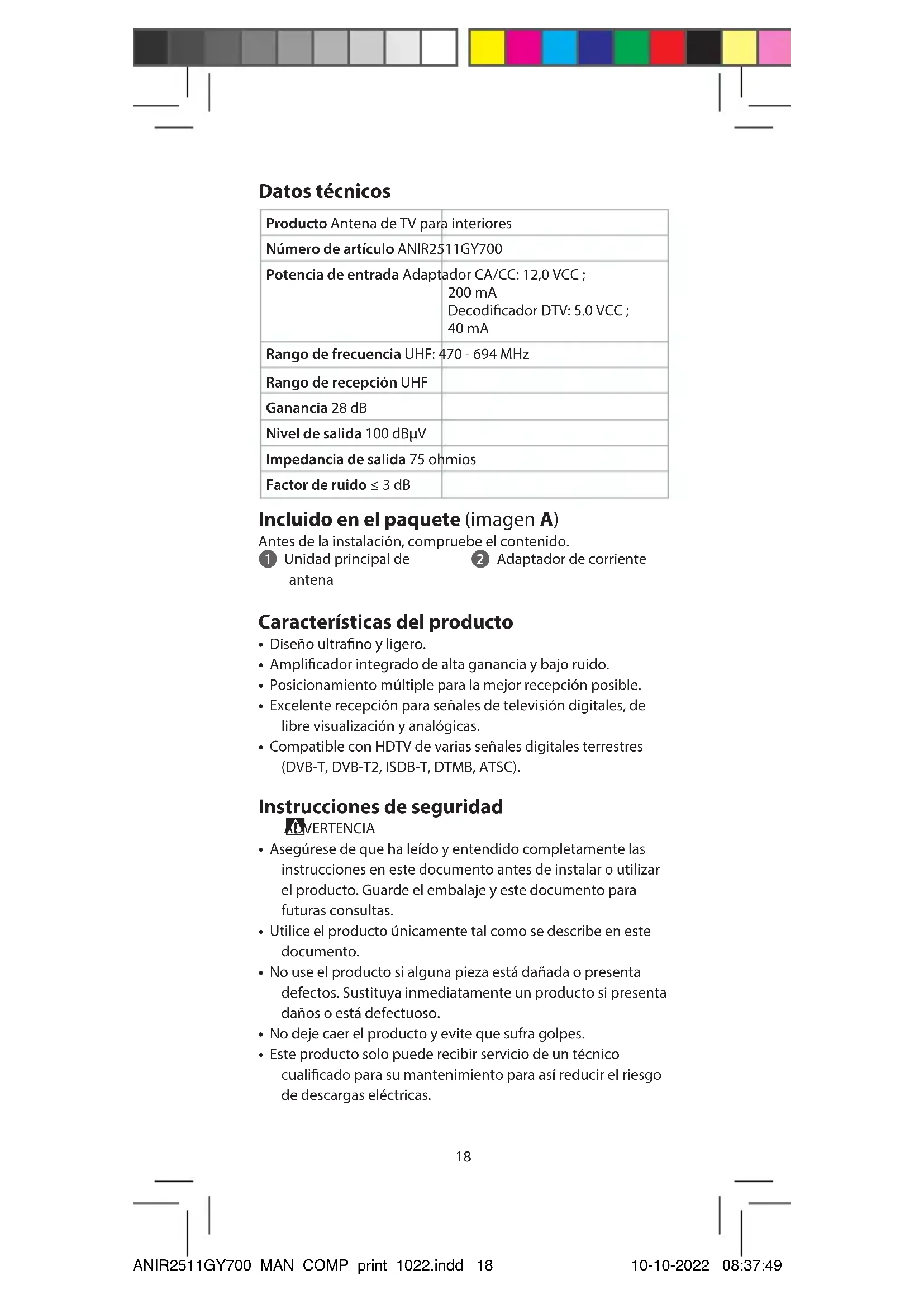 Guía de inicio rápido Antena de TV para interiores ANIR2511GY700 Uso previsto por el fabricante Este producto es una antena que se puede utilizar con un televisor o un decodicador que admita alimentación por cable coaxial. Se trata de una antena especialmente diseñada para la recepción de emisiones de televisión digital terrestre. El producto está diseñado únicamente para uso en interiores. ANIR2511GY700_MAN_COMP_print_1022.indd 17ANIR2511GY700_MAN_COMP_print_1022.indd 17 10-10-2022 08:37:4910-10-2022 08:37:4918 Datos técnicos Producto Antena de TV para interiores Número de artículo ANIR2511GY700 Potencia de entrada Adaptador CA/CC: 12,0 VCC ; 200 mA Decodicador DTV: 5.0 VCC ; 40 mA Rango de frecuencia UHF: 470 - 694 MHz Rango de recepción UHF Ganancia 28 dB Nivel de salida 100 dBµV Impedancia de salida 75 ohmios Factor de ruido ≤ 3 dB Incluido en el paquete (imagen A) Antes de la instalación, compruebe el contenido. 1 Unidad principal de antena 2 Adaptador de corriente Características del producto