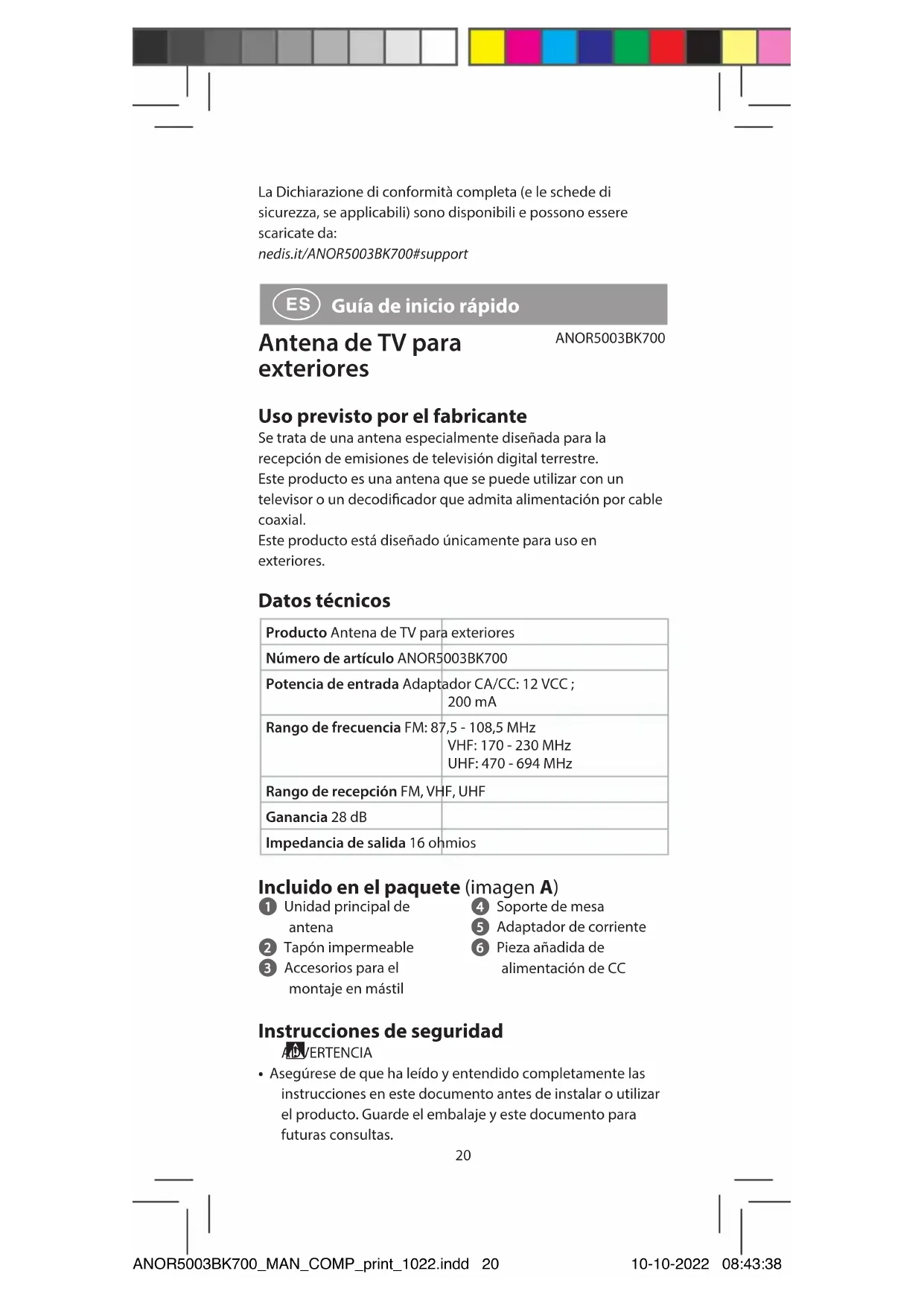 Guía de inicio rápido Antena de TV para exteriores ANOR5003BK700 Uso previsto por el fabricante Se trata de una antena especialmente diseñada para la recepción de emisiones de televisión digital terrestre.Este producto es una antena que se puede utilizar con un televisor o un decodicador que admita alimentación por cable coaxial.Este producto está diseñado únicamente para uso en exteriores. Datos técnicos Producto Antena de TV para exterioresNúmero de artículo ANOR5003BK700Potencia de entrada Adaptador CA/CC: 12 VCC ; 200 mARango de frecuencia FM: 87,5 - 108,5 MHzVHF: 170 - 230 MHzUHF: 470 - 694 MHzRango de recepción FM, VHF, UHFGanancia 28 dBImpedancia de salida 16 ohmios Incluido en el paquete (imagen A) 1 Unidad principal de antena 2 Tapón impermeable 3 Accesorios para el montaje en mástil 4 Soporte de mesa 5 Adaptador de corriente 6 Pieza añadida de alimentación de CC Instrucciones de seguridad