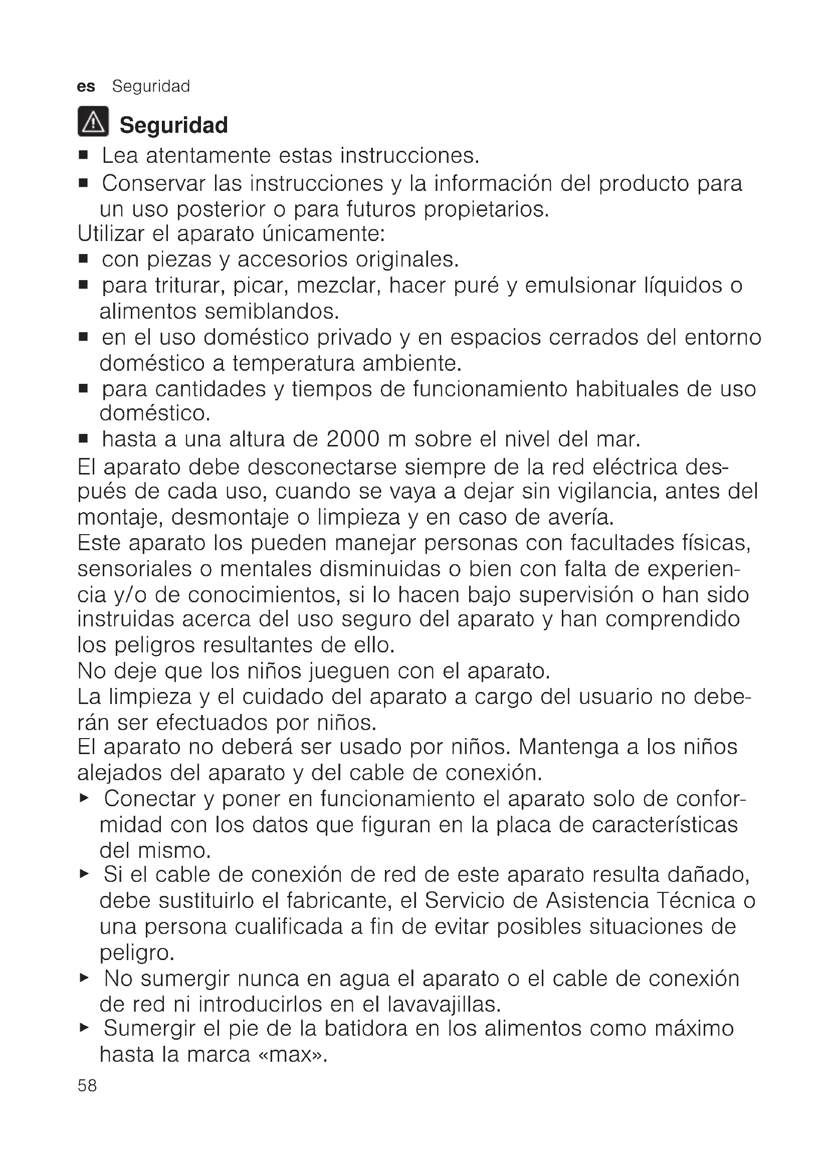 Seguridad ¡ Lea atentamente estas instrucciones. ¡ Conservar las instrucciones y la información del producto para un uso posterior o para futuros propietarios. Utilizar el aparato únicamente: ¡ con piezas y accesorios originales. ¡ para triturar, picar, mezclar, hacer puré y emulsionar líquidos o alimentos semiblandos. ¡ en el uso doméstico privado y en espacios cerrados del entorno doméstico a temperatura ambiente. ¡ para cantidades y tiempos de funcionamiento habituales de uso doméstico. ¡ hasta a una altura de 2000msobre el nivel del mar. El aparato debe desconectarse siempre de la red eléctrica des- pués de cada uso, cuando se vaya a dejar sin vigilancia, antes del montaje, desmontaje o limpieza y en caso de avería. Este aparato los pueden manejar personas con facultades físicas, sensoriales o mentales disminuidas o bien con falta de experien- cia y/o de conocimientos, si lo hacen bajo supervisión o han sido instruidas acerca del uso seguro del aparato y han comprendido los peligros resultantes de ello. No deje que los niños jueguen con el aparato. La limpieza y el cuidado del aparato a cargo del usuario no debe- rán ser efectuados por niños. El aparato no deberá ser usado por niños. Mantenga a los niños alejados del aparato y del cable de conexión. ▶ Conectar y poner en funcionamiento el aparato solo de confor- midad con los datos que figuran en la placa de características del mismo. ▶ Si el cable de conexión de red de este aparato resulta dañado, debe sustituirlo el fabricante, el Servicio de Asistencia Técnica o una persona cualificada a fin de evitar posibles situaciones de peligro. ▶ No sumergir nunca en agua el aparato o el cable de conexión de red ni introducirlos en el lavavajillas. ▶ Sumergir el pie de la batidora en los alimentos como máximo hasta la marca «max».Evitar daños materiales es