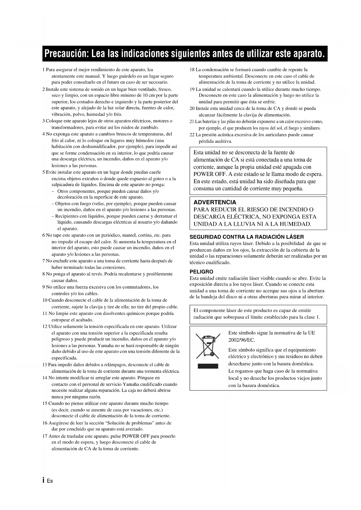 Otros componentes, porque pueden causar daños y/o decoloración en la superficie de este aparato. – Objetos con fuego (velas, por ejemplo), porque pueden causar un incendio, daños en el aparato y/o lesiones a las personas. – Recipientes con líquidos, porque pueden caerse y derramar el líquido, causando descargas eléctricas al usuario y/o dañando el aparato. 6 No tape este aparato con un periódico, mantel, cortina, etc. para no impedir el escape del calor. Si aumenta la temperatura en el interior del aparato, esto puede causar un incendio, daños en el aparato y/o lesiones a las personas. 7 No enchufe este aparato a una toma de corriente hasta después de haber terminado todas las conexiones. 8 No ponga el aparato al revés. Podría recalentarse y posiblemente causar daños. 9 No utilice una fuerza excesiva con los conmutadores, los controles y/o los cables. 10 Cuando desconecte el cable de la alimentación de la toma de corriente, sujete la clavija y tire de ella; no tire del propio cable. 11 No limpie este aparato con disolventes químicos porque podría estropear el acabado. 12 Utilice solamente la tensión especificada en este aparato. Utilizar el aparato con una tensión superior a la especificada resulta peligroso y puede producir un incendio, daños en el aparato y/o lesiones a las personas. Yamaha no se hará responsable de ningún daño debido al uso de este aparato con una tensión diferente de la especificada. 13 Para impedir daños debidos a relámpagos, desconecte el cable de alimentación de la toma de corriente durante una tormenta eléctrica. 14 No intente modificar ni arreglar este aparato. Póngase en contacto con el personal de servicio Yamaha cualificado cuando necesite realizar alguna reparación. La caja no deberá abrirse nunca por ninguna razón. 15 Cuando no piense utilizar este aparato durante mucho tiempo (es decir, cuando se ausente de casa por vacaciones, etc.) desconecte el cable de alimentación de la toma de corriente. 16 Asegúrese de leer la sección “Solución de problemas” antes de dar por concluido que su aparato está averiado. 17 Antes de trasladar este aparato, pulse POWER OFF para ponerlo en el modo de espera, y luego desconecte el cable de alimentación de CA de la toma de corriente. 18 La condensación se formará cuando cambie de repente la temperatura ambiental. Desconecte en este caso el cable de alimentación de la toma de corriente y no utilice la unidad. 19 La unidad se calentará cuando la utilice durante mucho tiempo. Desconecte en este caso la alimentación y luego no utilice la unidad para permitir que ésta se enfríe. 20 Instale esta unidad cerca de la toma de CA y donde se pueda alcanzar fácilmente la clavija de alimentación. 21 Las baterías y las pilas no deberán exponerse a un calor excesivo como, por ejemplo, el que producen los rayos del sol, el fuego y similares. 22 La presión acústica excesiva de los auriculares puede causar pérdida auditiva. SEGURIDAD CONTRA LA RADIACIÓN LÁSER Esta unidad utiliza rayos láser. Debido a la posibilidad de que se produzcan daños en los ojos, la extracción de la cubierta de la unidad o las reparaciones solamente deberán ser realizadas por un técnico cualificado. PELIGRO Esta unidad emite radiación láser visible cuando se abre. Evite la exposición directa a los rayos láser. Cuando se conecte esta unidad a una toma de corriente no acerque sus ojos a la abertura de la bandeja del disco ni a otras aberturas para mirar al interior. Precaución: Lea las indicaciones siguientes antes de utilizar este aparato. Esta unidad no se desconecta de la fuente de alimentación de CA si está conectada a una toma de corriente, aunque la propia unidad esté apagada con POWER OFF. A este estado se le llama modo de espera. En este estado, está unidad ha sido diseñada para que consuma un cantidad de corriente muy pequeña. ADVERTENCIA PARA REDUCIR EL RIESGO DE INCENDIO O