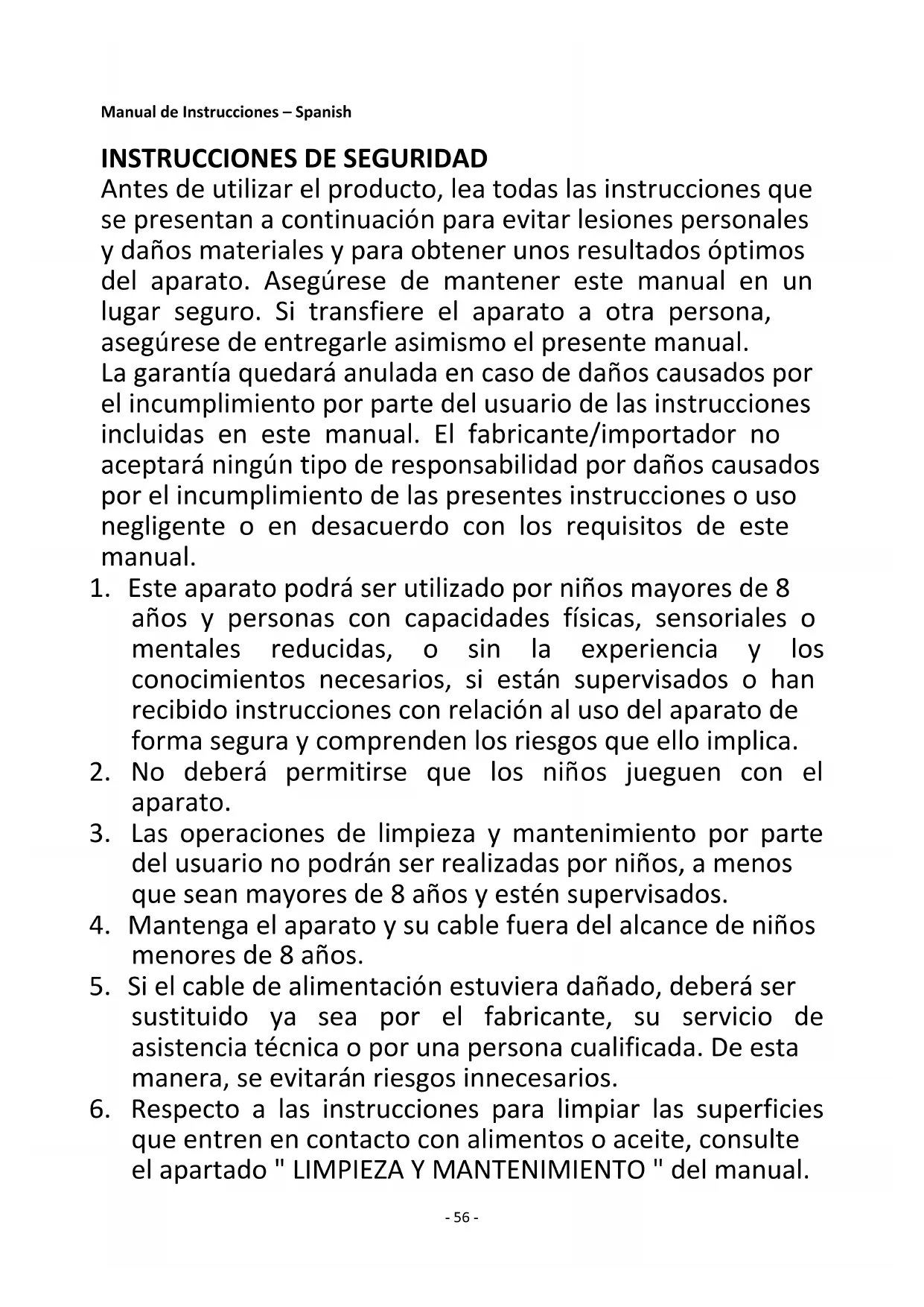 Antes de utilizar el producto, lea todas las instrucciones que se presentan a continuación para evitar lesiones personales y daños materiales y para obtener unos resultados óptimos del aparato. Asegúrese de mantener este manual en un lugar seguro. Si transfiere el aparato a otra persona, asegúrese de entregarle asimismo el presente manual. La garantía quedará anulada en caso de daños causados por el incumplimiento por parte del usuario de las instrucciones incluidas en este manual. El fabricante/importador no aceptará ningún tipo de responsabilidad por daños causados por el incumplimiento de las presentes instrucciones o uso negligente o en desacuerdo con los requisitos de este manual.