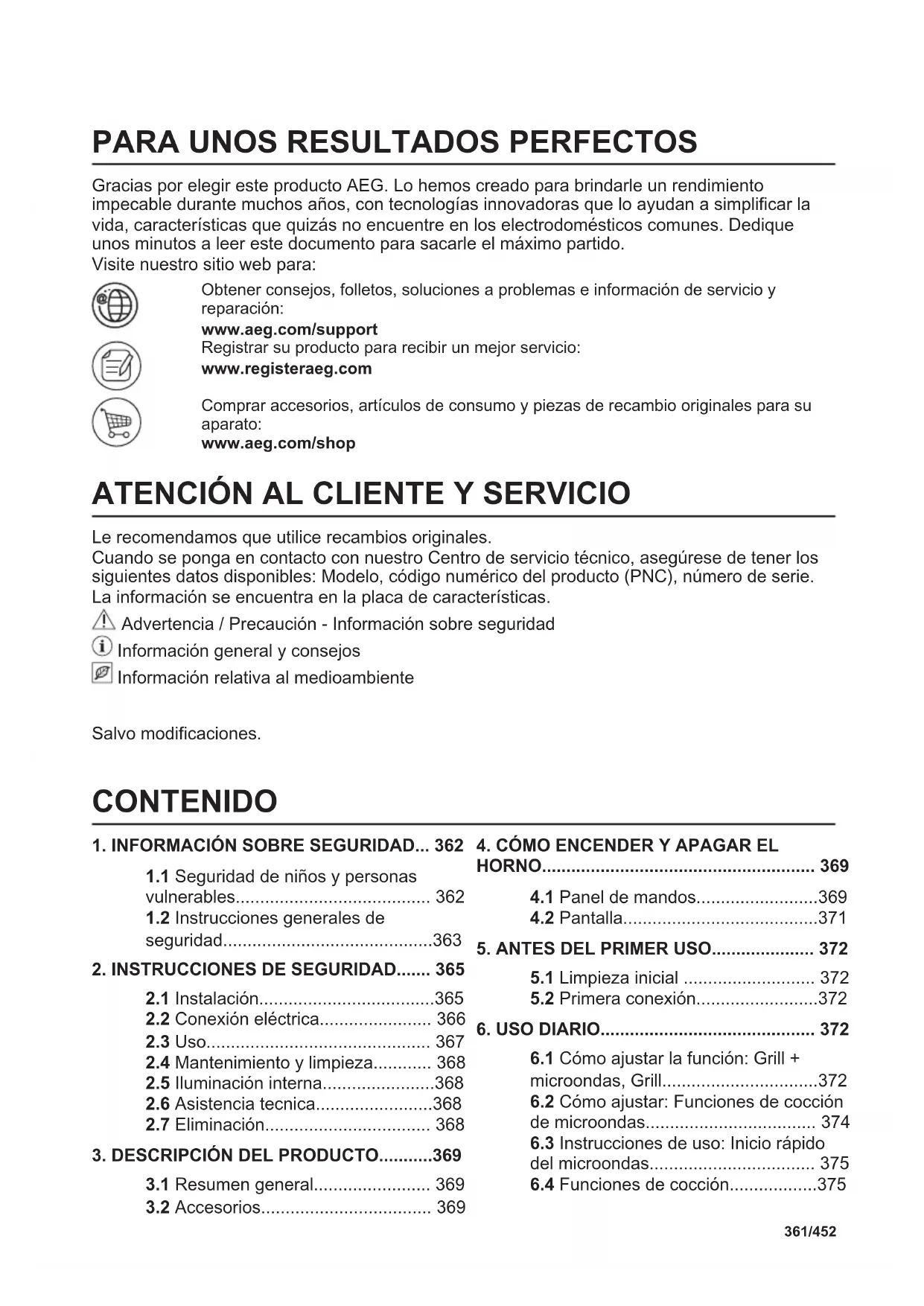 Materiály označené symbolom odovzdajte na recykláciu. Obal hoďte do príslušných kontajnerov na recykláciu. Chráňte životné prostredie a zdravie ľudí a recyklujte odpad z elektrických a elektronických spotrebičov. Nelikvidujte spotrebiče označené symbolom spolu s odpadom z domácnosti. Výrobok odovzdajte v miestnom recyklačnom zariadení alebo sa obráťte na obecný alebo mestský úrad. 360/452 JE TO JEDNODUCHÉ!PARA UNOS RESULTADOS PERFECTOS Gracias por elegir este producto AEG. Lo hemos creado para brindarle un rendimiento impecable durante muchos años, con tecnologías innovadoras que lo ayudan a simplificar la vida, características que quizás no encuentre en los electrodomésticos comunes. Dedique unos minutos a leer este documento para sacarle el máximo partido. Visite nuestro sitio web para: Obtener consejos, folletos, soluciones a problemas e información de servicio y reparación: www.aeg.com/support Registrar su producto para recibir un mejor servicio: www.registeraeg.com Comprar accesorios, artículos de consumo y piezas de recambio originales para su aparato: www.aeg.com/shop