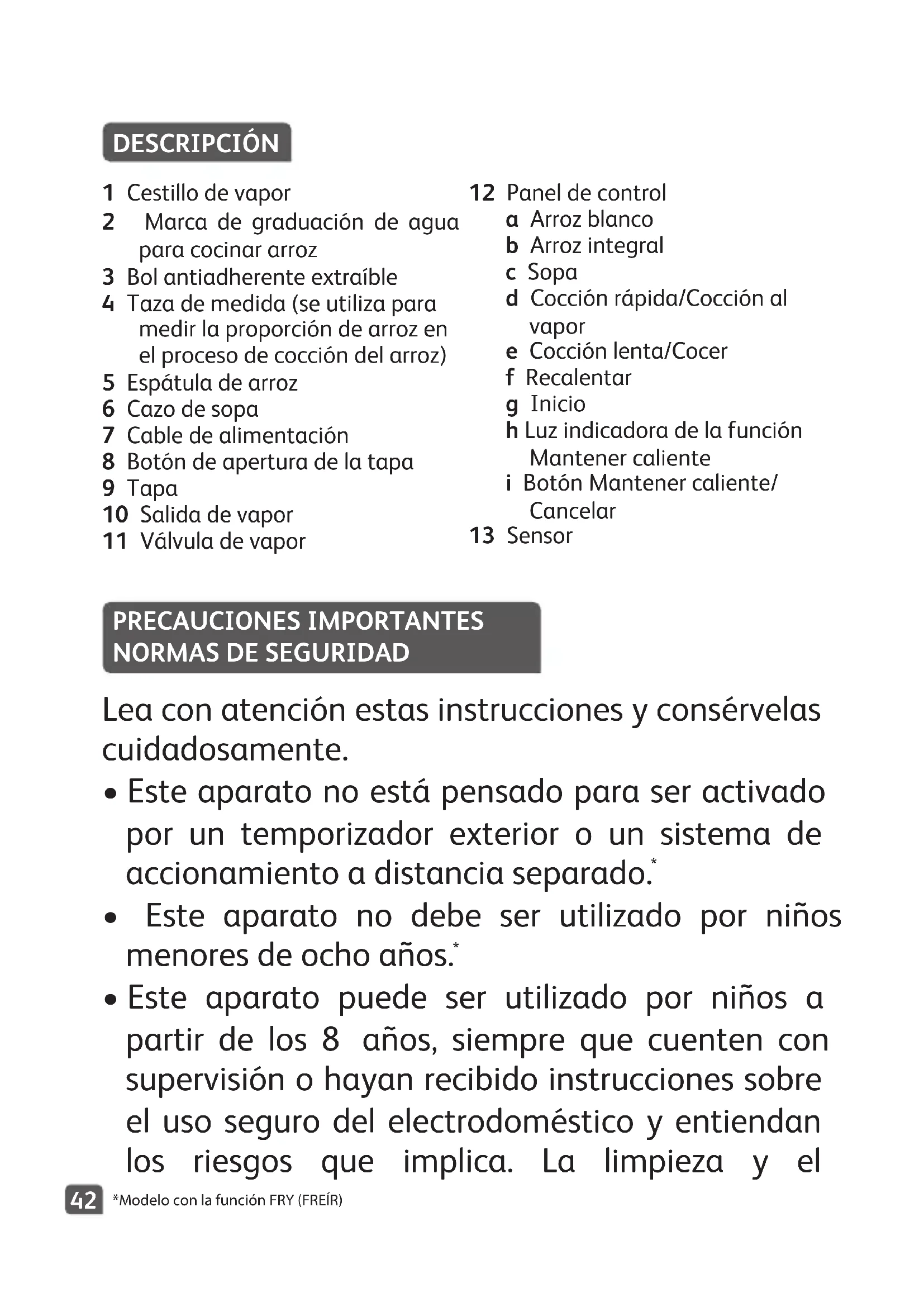 - Este aparato puede ser utilizado por niños a partir de los 8 años, siempre que cuenten con supervisión o hayan recibido instrucciones sobre el uso seguro del electrodoméstico y entiendan los riesgos que implica. La limpieza y el *Modelo con la función FRY(FREÍR) PRECAUCIONES IMPORTANTES