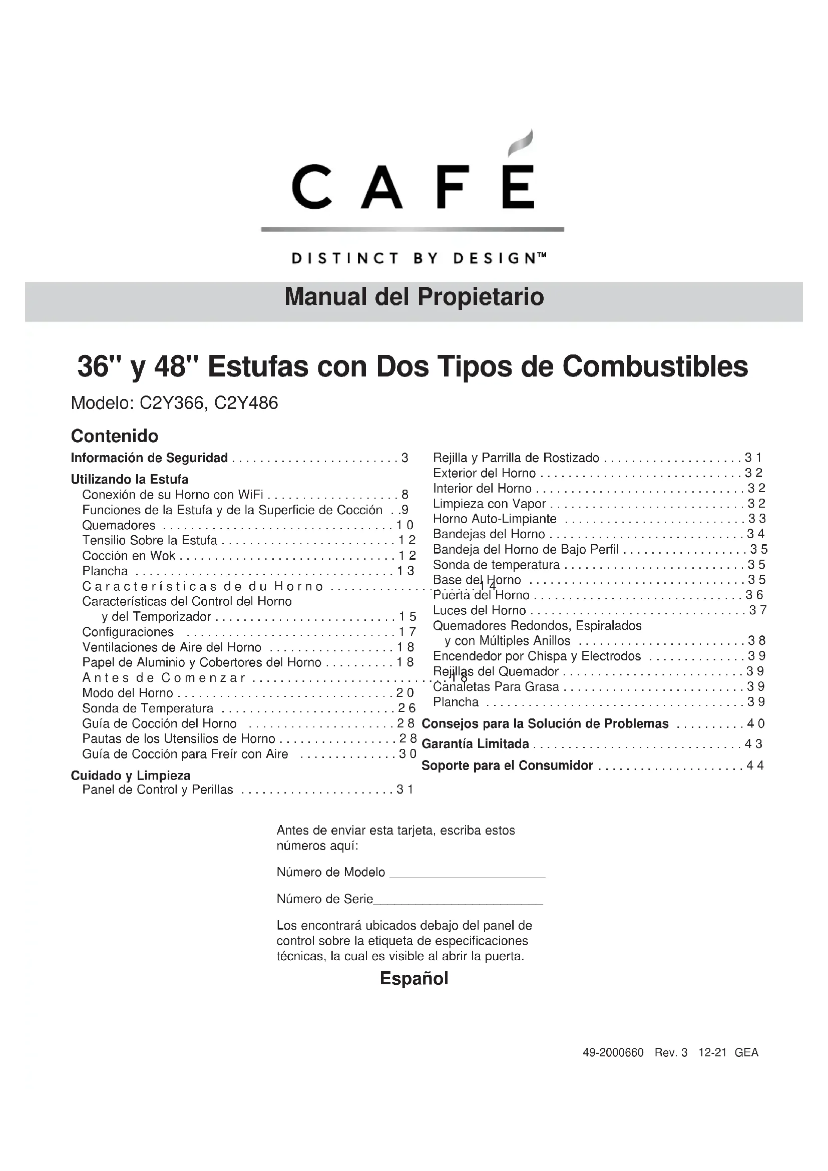 GRACIAS POR HACER QUE CAFÉ SEA PARTE DE SU HOGAR. Sentimos orgullo por el nivel de arte, innovación y diseño de cada uno de los electrodomésticos de Café, y creemos que usted también. Entre otras cosas, el registro de su electrodoméstico asegura que podamos entregarle información importante del producto y detalles de la garantía cuando los necesite. Registre su electrodoméstico Café ahora a través de Internet. Sitios web útiles están disponibles en la sección de Soporte para el Consumidor de este Manual del Propietario. También puede enviar una carta en la tarjeta de inscripción preimpresa que se incluye con el material embalado.49-2000660 Rev. 3 3