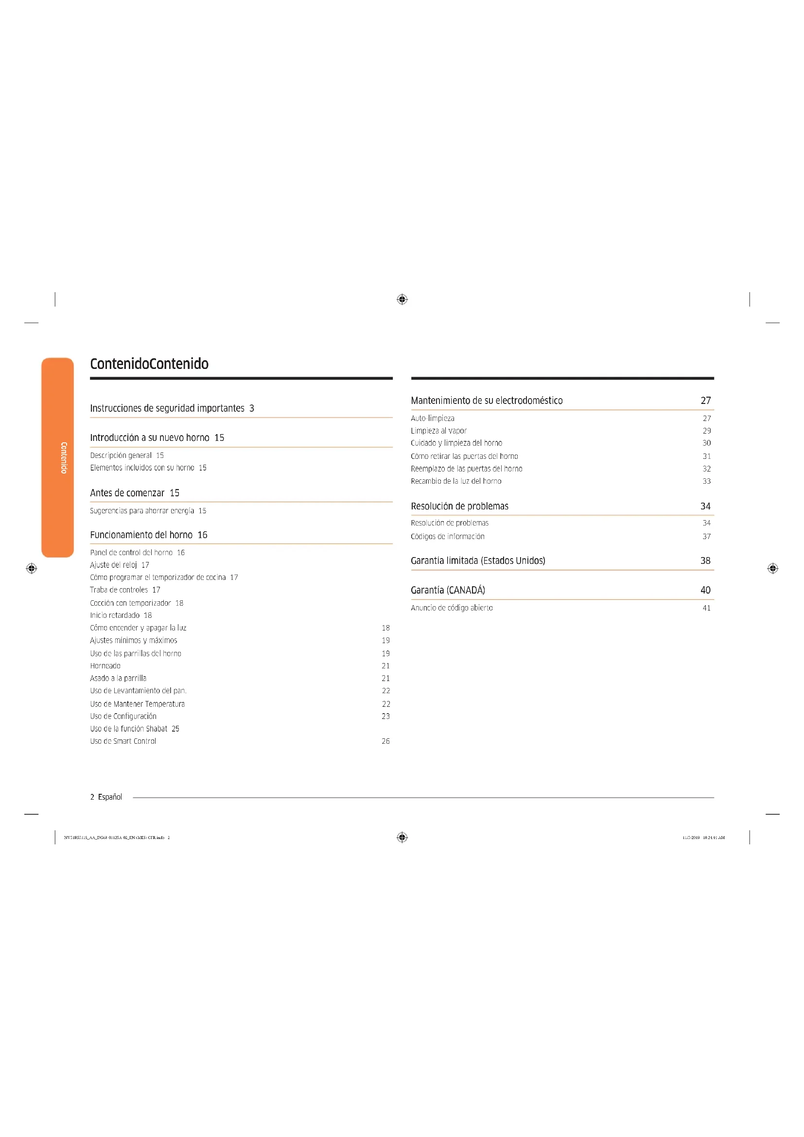 - Requires reader to be installed on your smartphone NV51R5511S_AA_DG68-01125A-02_EN+MES+CFR.indb 44 11/5/2019 10:24:36 AMHorno eléctrico empotrado en pared Manual del usuario NV51*5***S* NV51R5511S_AA_DG68-01125A-02_EN+MES+CFR.indb 1 11/5/2019 10:24:44 AM2 Español Contenido ContenidoContenido Instrucciones de seguridad importantes 3 Introducción a su nuevo horno 15 Descripción general 15 Elementos incluidos con su horno 15 Antes de comenzar 15 Sugerencias para ahorrar energía 15 Funcionamiento del horno 16 Panel de control del horno 16 Ajuste del reloj 17 Cómo programar el temporizador de cocina 17 Traba de controles 17 Cocción con temporizador 18 Inicio retardado 18 Cómo encender y apagar la luz 18 Ajustes mínimos y máximos 19 Uso de las parrillas del horno 19 Horneado 21 Asado a la parrilla 21 Uso de Levantamiento del pan. 22 Uso de Mantener Temperatura 22 Uso de Conguración 23 Uso de la función Shabat 25 Uso de Smart Control 26 Mantenimiento de su electrodoméstico 27 Auto-limpieza 27 Limpieza al vapor 29 Cuidado y limpieza del horno 30 Cómo retirar las puertas del horno 31 Reemplazo de las puertas del horno 32 Recambio de la luz del horno 33 Resolución de problemas 34 Resolución de problemas 34 Códigos de información 37 Garantía limitada (Estados Unidos) 38 Garantía (CANADÁ) 40 Anuncio de código abierto 41 NV51R5511S_AA_DG68-01125A-02_EN+MES+CFR.indb 2 11/5/2019 10:24:44 AMEspañol 3 Instrucciones de seguridad importantes