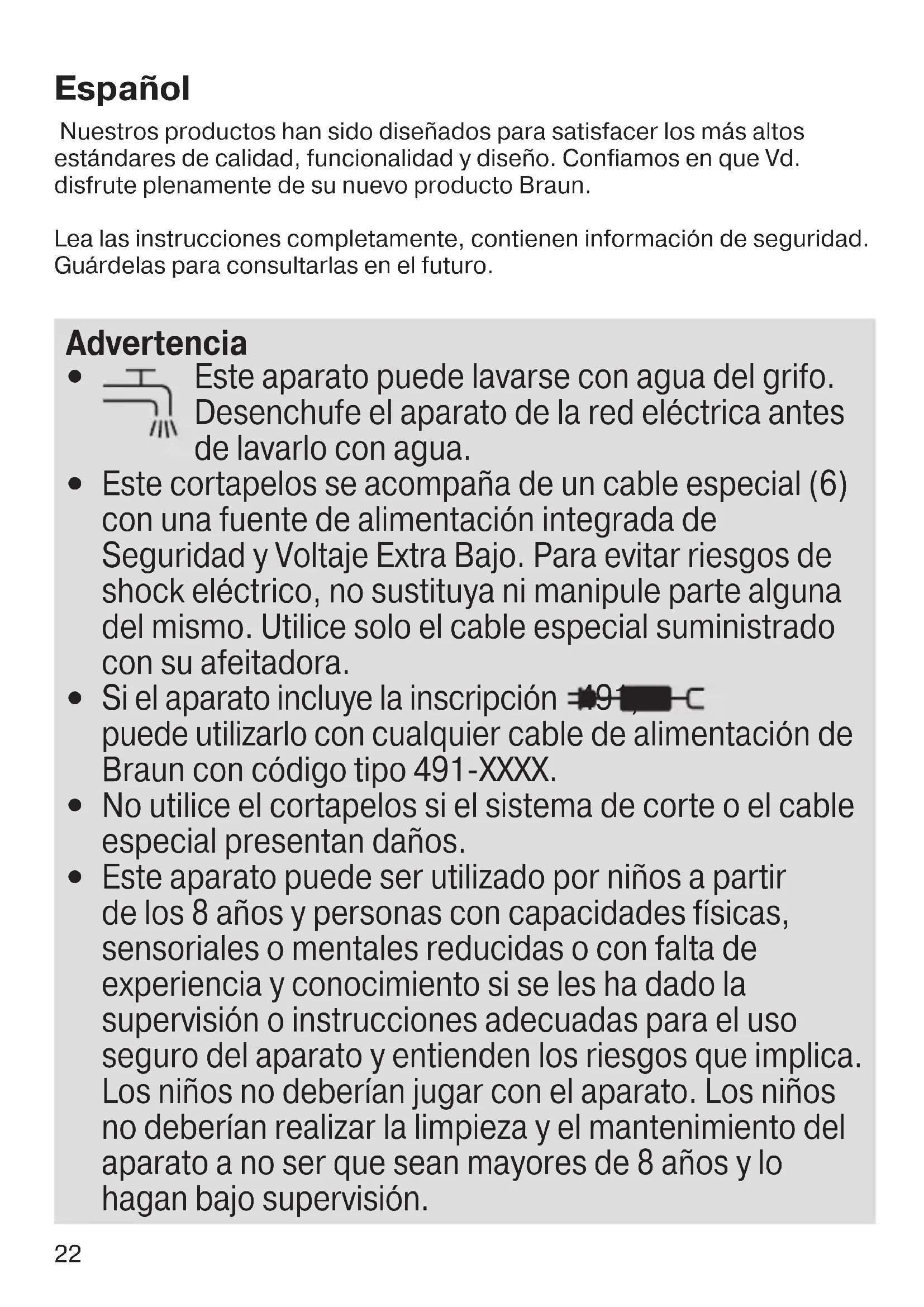 Si el aparato incluye la inscripción 491, puede utilizarlo con cualquier cable de alimentación de Braun con código tipo 491-XXXX.