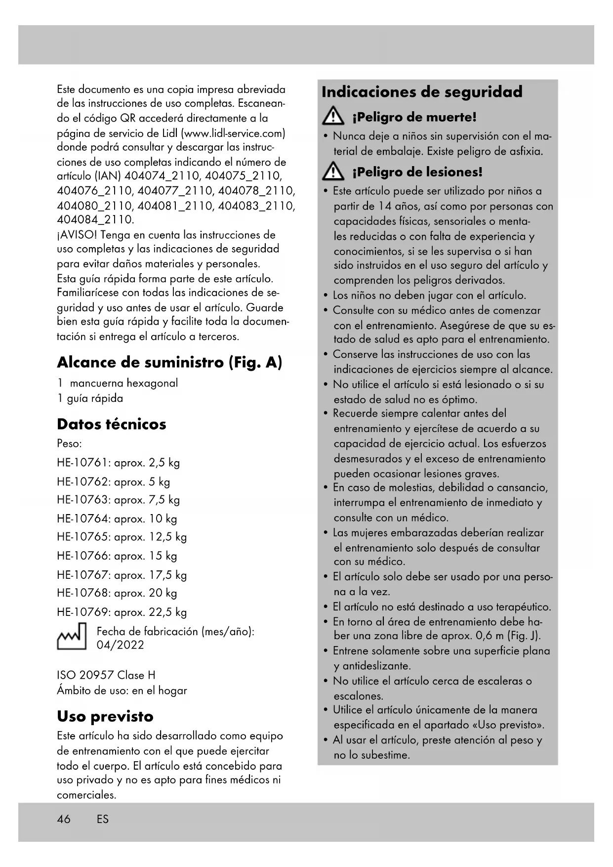 Dôležité: Dbajte na to, aby vaše stehná zostali paralelne vedľa seba. Panvu pritom posuňte dopredu, horná časť tela zostáva vzpriamená. Skladovanie, čistenie Pri nepoužívaní skladujte výrobok vždy suchý a čistý pri izbovej teplote. Čistite len vlhkou čistiacou handričkou a nako- niec utrite dosucha. DÔLEŽITÉ! Výrobok nikdy nečistite ostrými čistia- cimi prostriedkami.46 Este documento es una copia impresa abreviada de las instrucciones de uso completas. Escanean- do el código QR accederá directamente a la página de servicio de Lidl (www.lidl-service.com) donde podrá consultar y descargar las instruc- ciones de uso completas indicando el número de artículo (IAN) 404074_2110, 404075_2110, 404076_2110, 404077_2110, 404078_2110, 404080_2110, 404081_2110, 404083_2110, 404084_2110. ¡AVISO! Tenga en cuenta las instrucciones de uso completas y las indicaciones de seguridad para evitar daños materiales y personales. Esta guía rápida forma parte de este artículo. Familiarícese con todas las indicaciones de se- guridad y uso antes de usar el artículo. Guarde bien esta guía rápida y facilite toda la documen- tación si entrega el artículo a terceros. Alcance de suministro (Fig. A) 1 mancuerna hexagonal 1 guía rápida Datos técnicos Peso: HE-10761: aprox. 2,5 kg HE-10762: aprox. 5 kg HE-10763: aprox. 7,5 kg HE-10764: aprox. 10 kg HE-10765: aprox. 12,5 kg HE-10766: aprox. 15 kg HE-10767: aprox. 17,5 kg HE-10768: aprox. 20 kg HE-10769: aprox. 22,5 kg Fecha de fabricación (mes/año): 04/2022 ISO 20957 Clase H Ámbito de uso: en el hogar Uso previsto Este artículo ha sido desarrollado como equipo de entrenamiento con el que puede ejercitar todo el cuerpo. El artículo está concebido para uso privado y no es apto para fines médicos ni comerciales. Indicaciones de seguridad ¡Peligro de muerte!