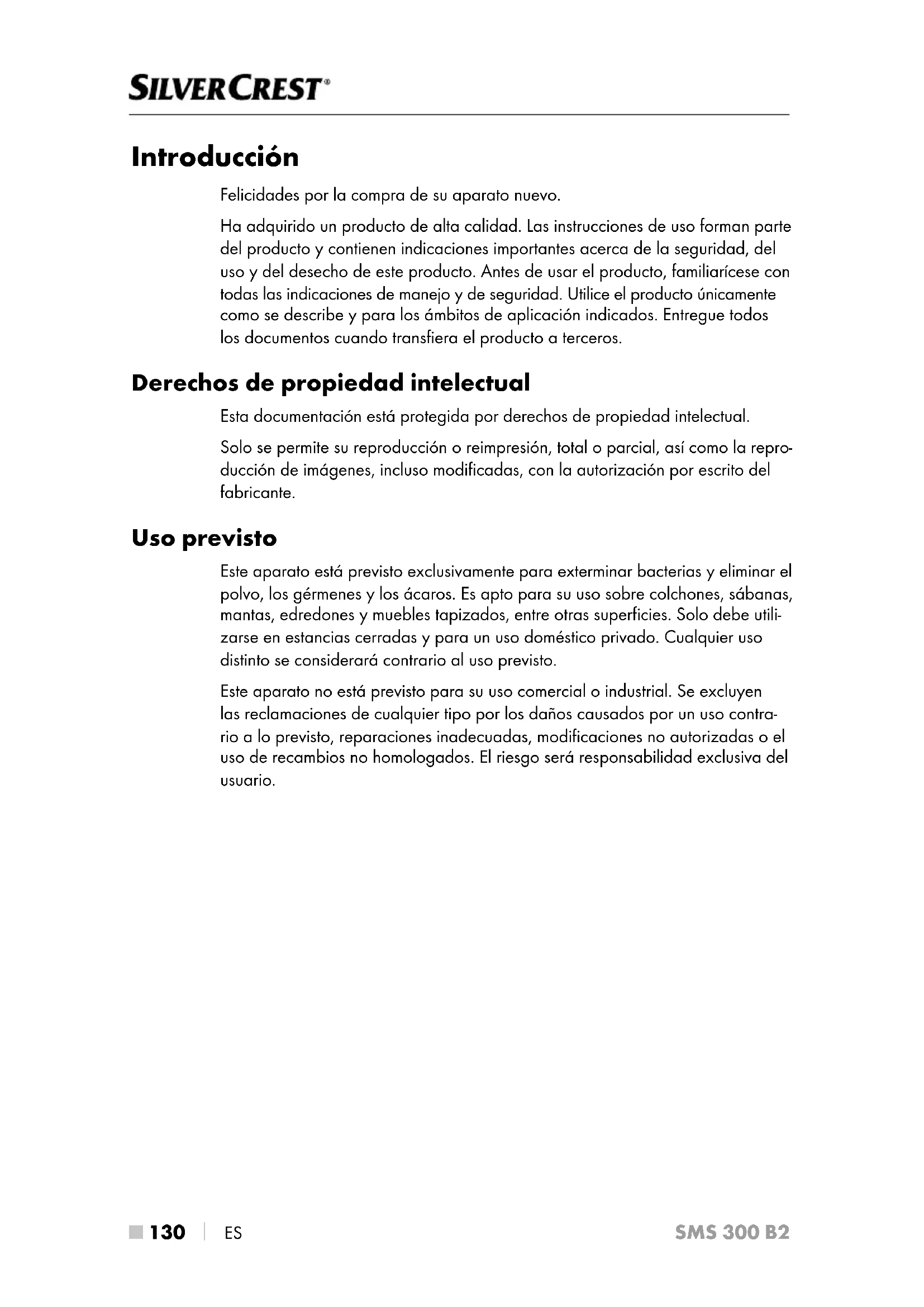 ES SMS 300 B2 Introducción Felicidades por la compra de su aparato nuevo. Ha adquirido un producto de alta calidad. Las instrucciones de uso forman parte del producto y contienen indicaciones importantes acerca de la seguridad, del uso y del desecho de este producto. Antes de usar el producto, familiarícese con todas las indicaciones de manejo y de seguridad. Utilice el producto únicamente como se describe y para los ámbitos de aplicación indicados. Entregue todos los documentos cuando transfiera el producto a terceros. Derechos de propiedad intelectual Esta documentación está protegida por derechos de propiedad intelectual. Solo se permite su reproducción o reimpresión, total o parcial, así como la repro- ducción de imágenes, incluso modificadas, con la autorización por escrito del fabricante. Uso previsto Este aparato está previsto exclusivamente para exterminar bacterias y eliminar el polvo, los gérmenes y los ácaros. Es apto para su uso sobre colchones, sábanas, mantas, edredones y muebles tapizados, entre otras superficies. Solo debe utili- zarse en estancias cerradas y para un uso doméstico privado. Cualquier uso distinto se considerará contrario al uso previsto. Este aparato no está previsto para su uso comercial o industrial. Se excluyen las reclamaciones de cualquier tipo por los daños causados por un uso contra- rio a lo previsto, reparaciones inadecuadas, modificaciones no autorizadas o el uso de recambios no homologados. El riesgo será responsabilidad exclusiva del usuario.ES